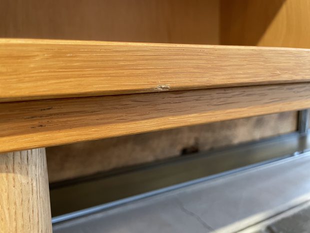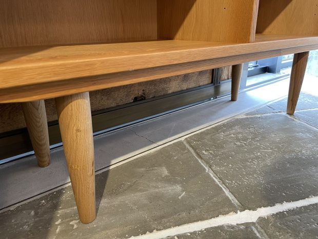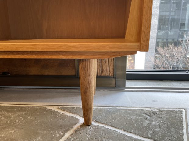 フルオープンで、可動できる棚板の断面は斜めにカットを施され、実際の厚みよりもシャープに魅せる工夫が。