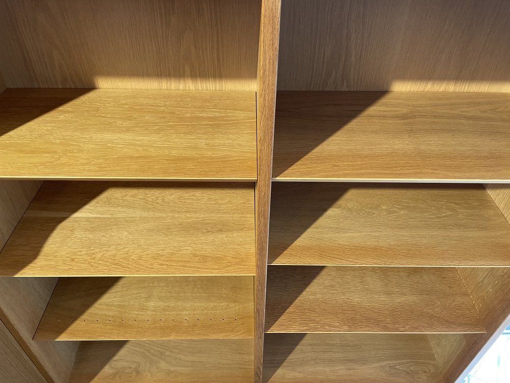 フルオープンで、可動できる棚板の断面は斜めにカットを施され、実際の厚みよりもシャープに魅せる工夫が。