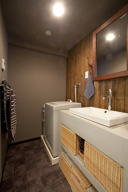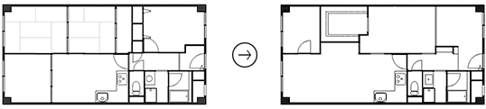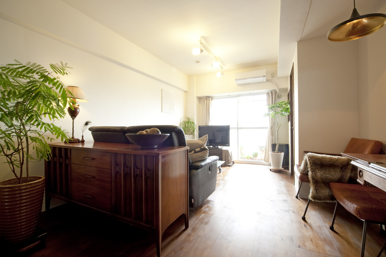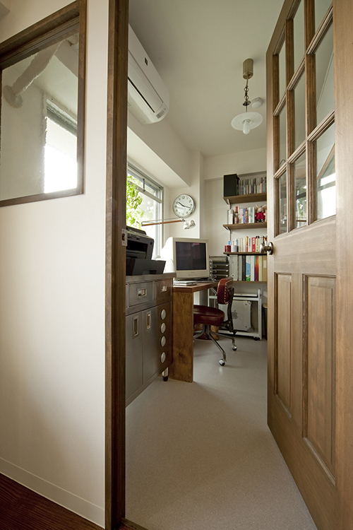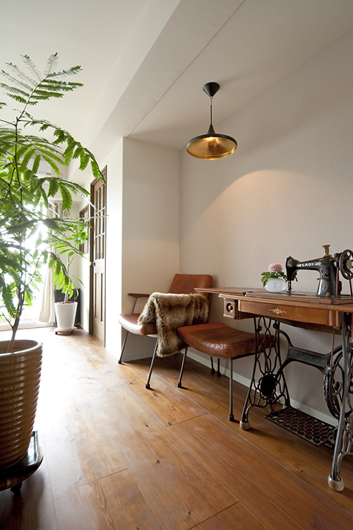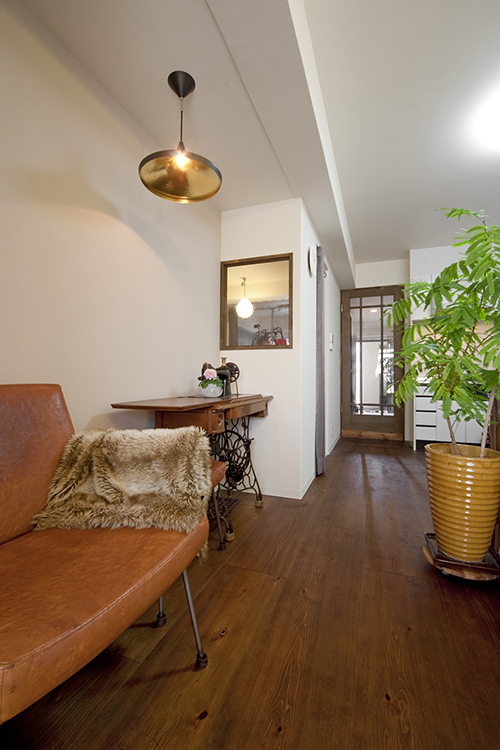 自転車の移動がスムーズにできるだけの土間のスペースを確保。お施主様こだわりの家具のサイズをすべて測り、パズルのように配置を考え、LDK、寝室、SOHOと空間設計。DIYで、300万円でほぼ全面改装が実現しました。