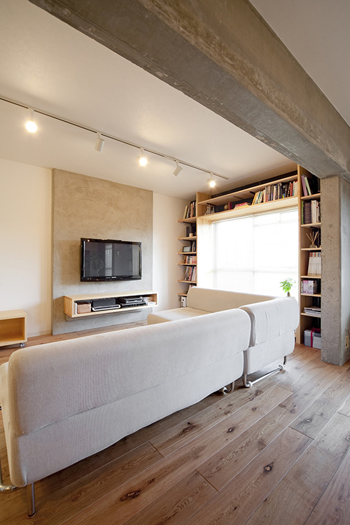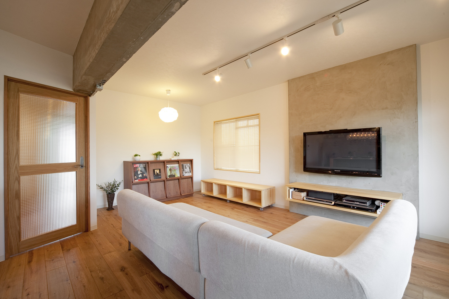 素材の組合わせの面白さもご提案。邪魔な梁も敢えて剥き出し、TVの背面にモルタル使用。何枚もの3D画像で楽しくわかりやすいプランのご提案をいたしました。