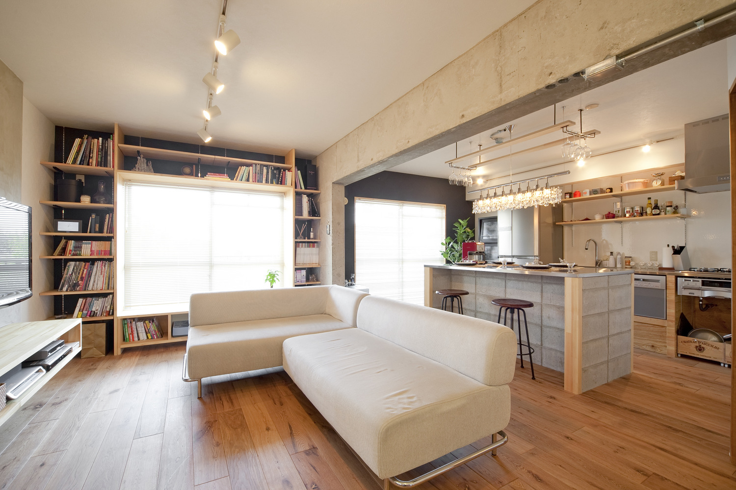 窓のまわりの本棚&ベンチは、奥様がイメージのイラストを描いてくださり、それを元に棚の構造や仕様を決めていき、ご一緒に作り上げることができました。お住まい後、キッチンの下台にさりげなくワインの木箱を置かれていたのが、とても格好良かったです。