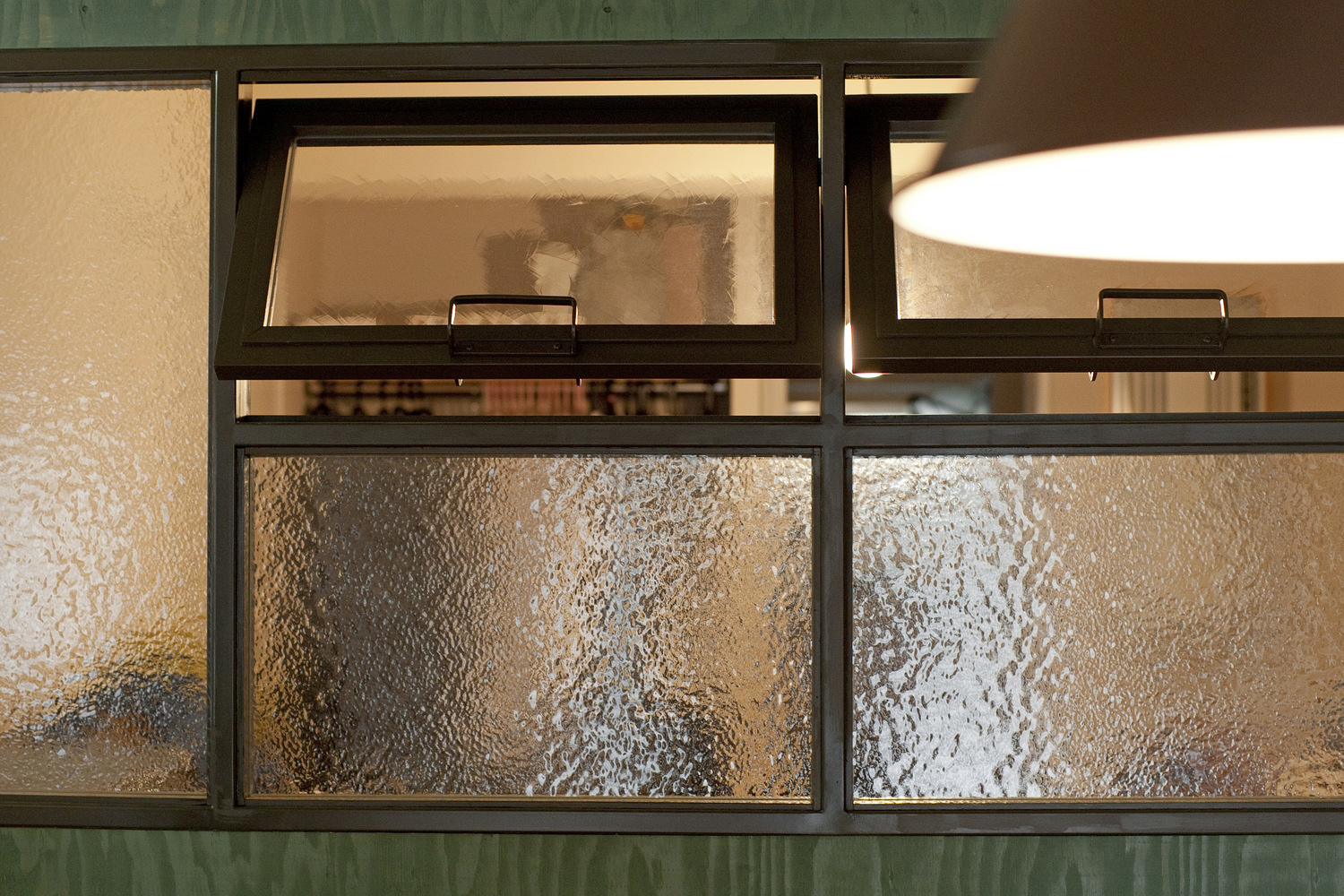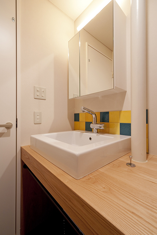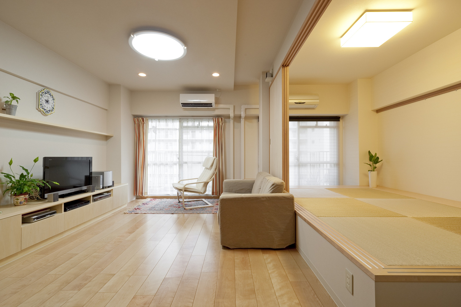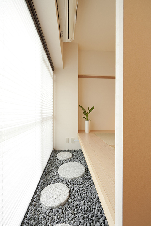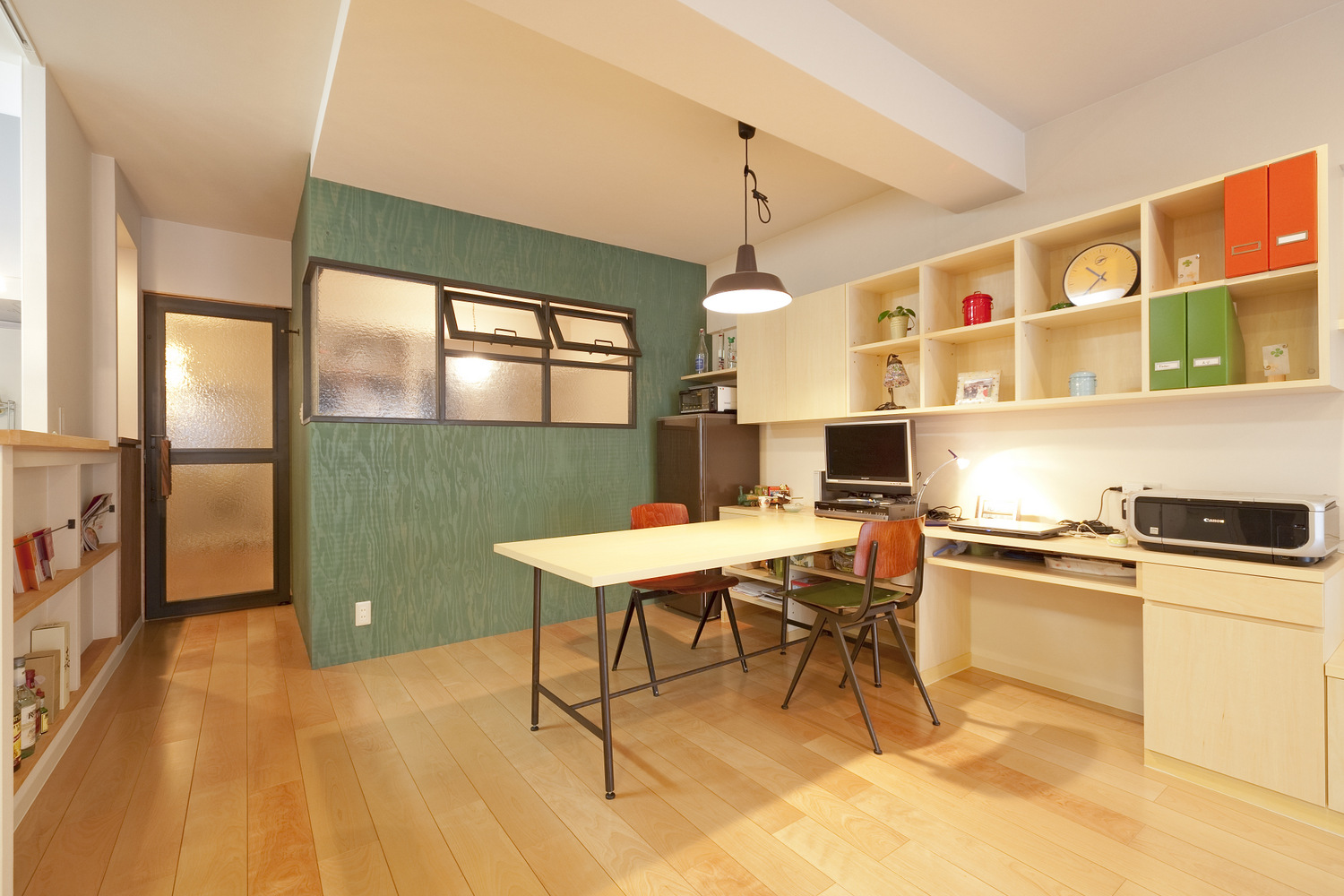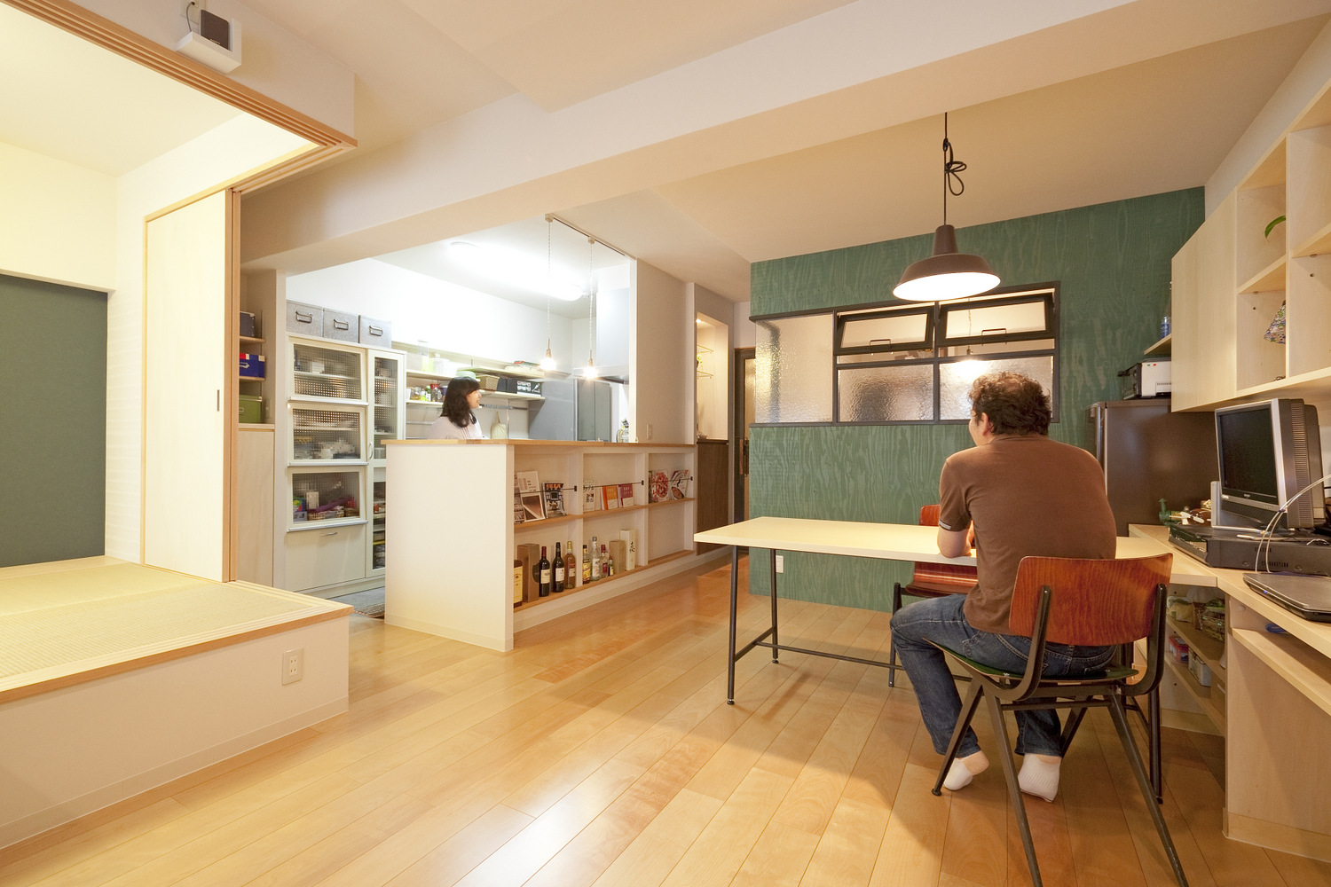 床上収納のある和室を、ベランダ側に配置。ベランダ側には「座れるように」と玉砂利を敷き詰めた縁側風スペースをご提案。寝室は緑色に塗装した構造用合板で間仕切り、採光・通風に配慮してFIX窓×回転窓を採用。「バーカウンターがほしい」とのご要望に、ブックシェルフも兼ねそえた対面式キッチンは、バーカウンターを造作。お酒を楽しめるスペースにもなります。