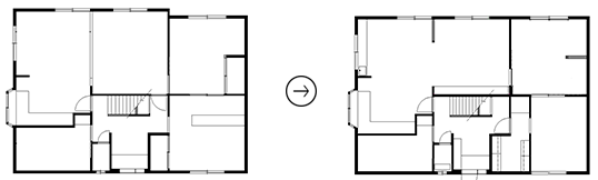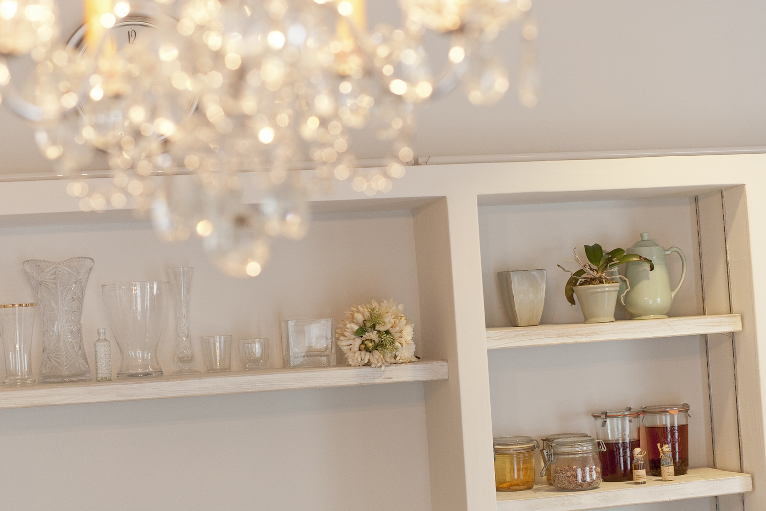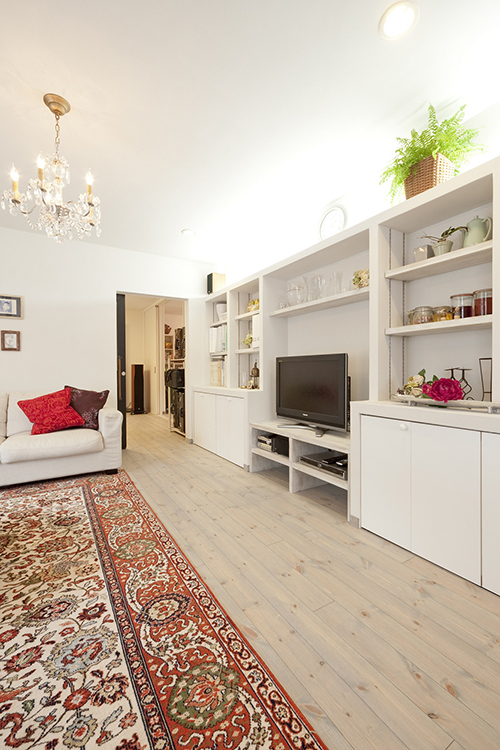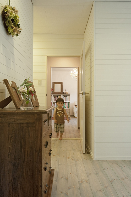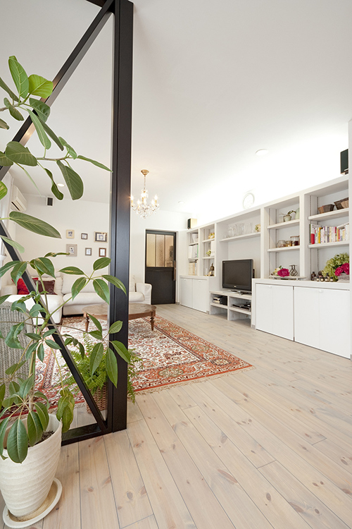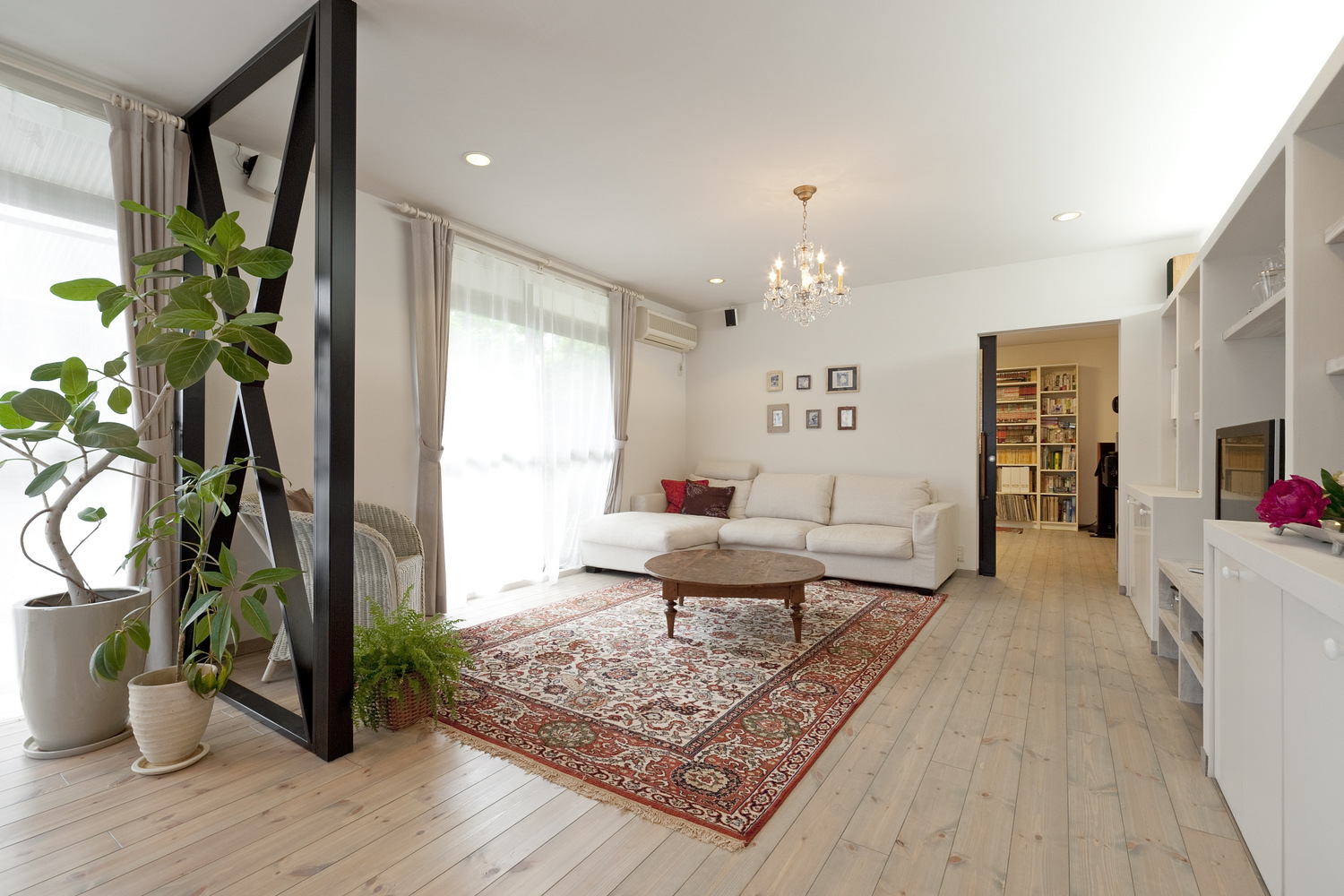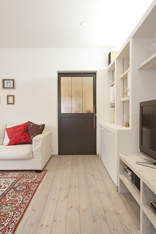 無駄な動線を省くために2つのリビングドアの片方を塞ぎ、ぐるりとまわれる動線を提案。壁は珪藻土、床のパイン材はシックなグレー色に。『アンティークが似合うフレンチスタイル』の完成です。「LDKに本棚を」との要望にも古材風棚板自らプランナーが作りスタイルを追求しました。