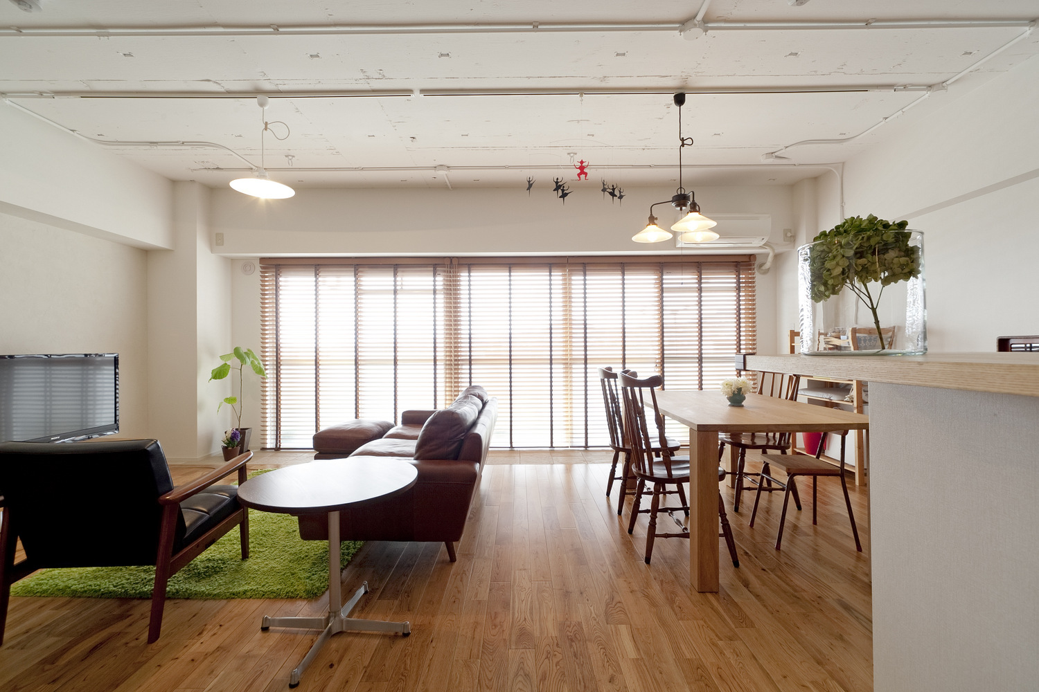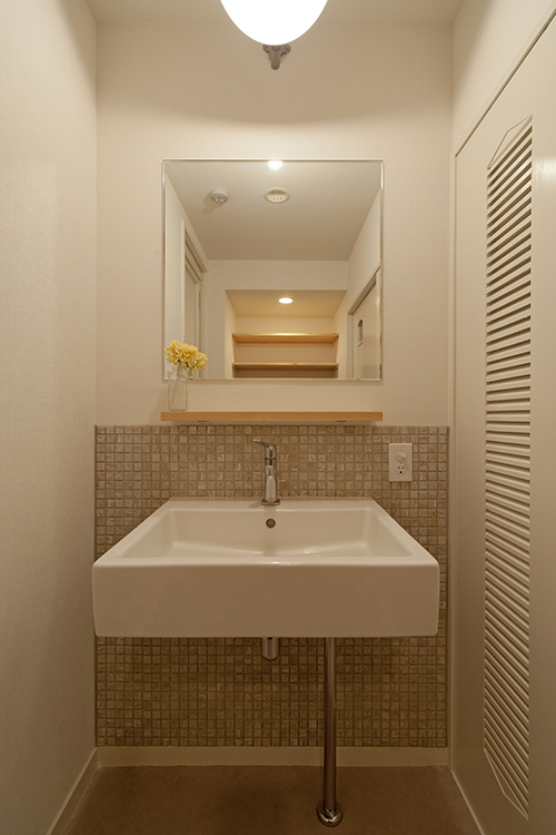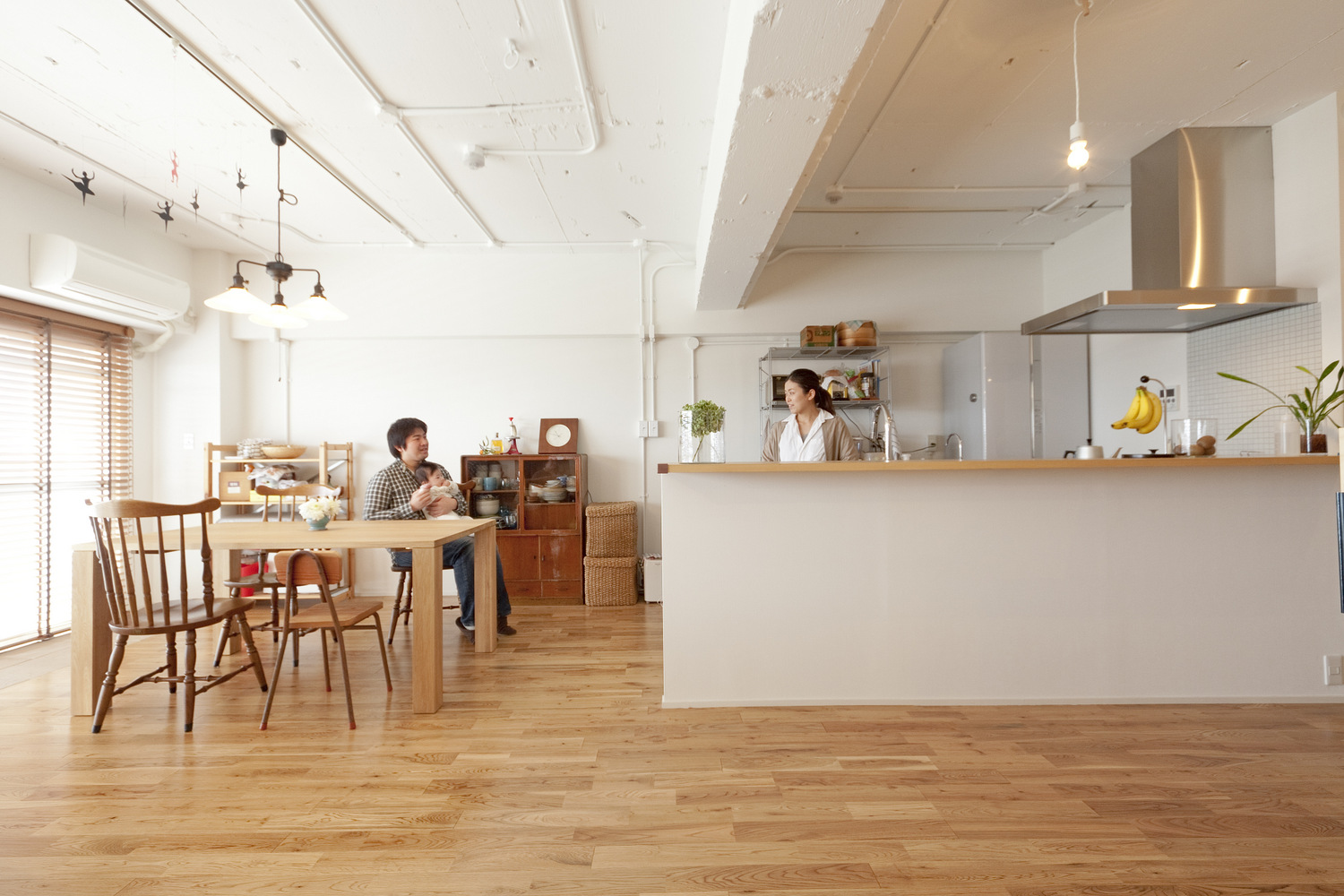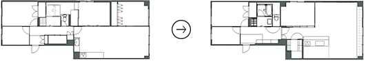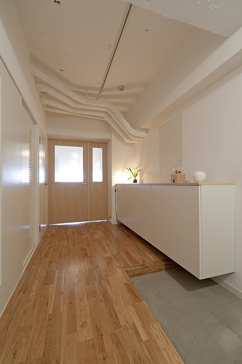 LDKと廊下は天井、床まで取り払いスケルトンにして大改造。床には無垢のナラ材を敷き詰め、剥き出しの天井は白塗装仕上げで倉庫風に。玄関横の収納を排して廊下と玄関を規格外の広さにすることでLDKと繋がる開放的な空間が誕生しました。ウォークインクロゼットの配置にはお施主様のアイデアでキッチン横に新設、すっきりと収まりました。