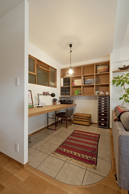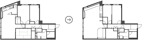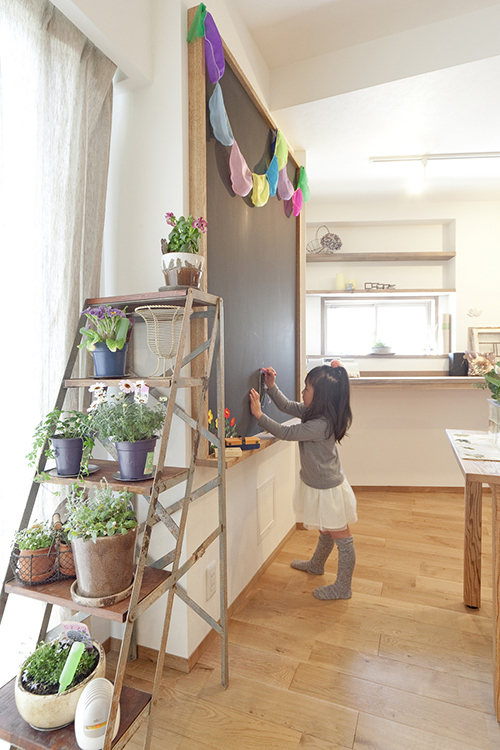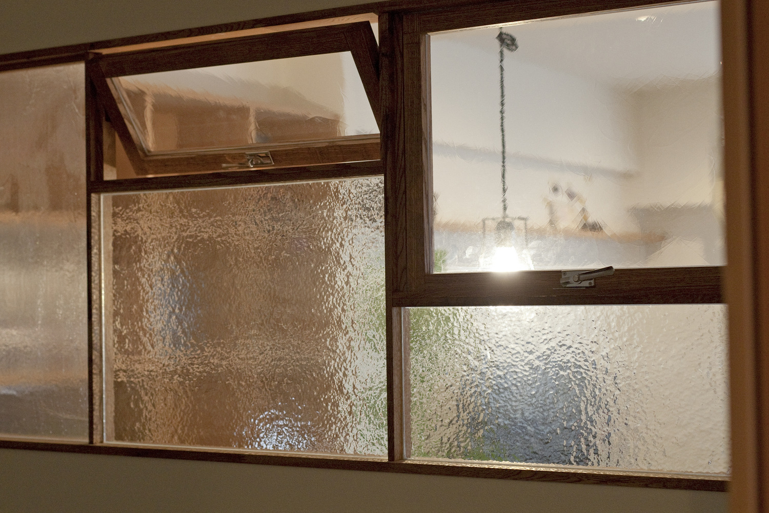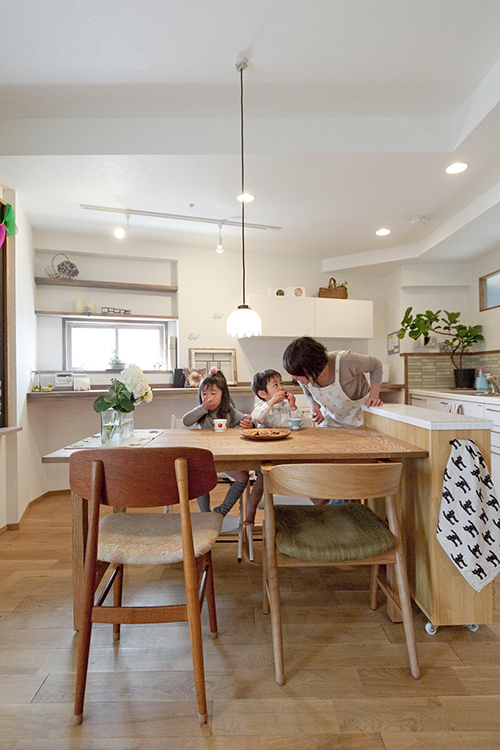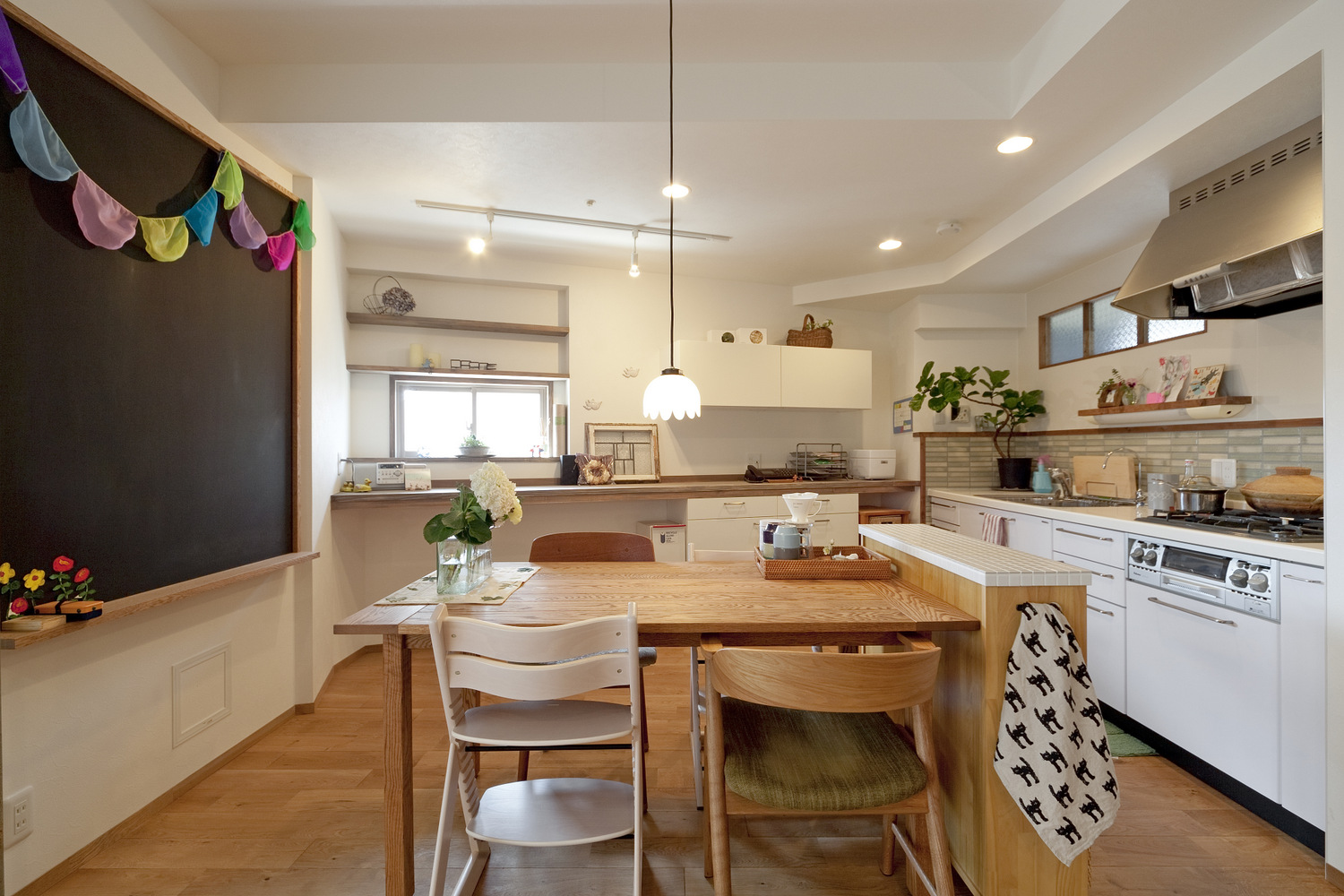 「キッチンの窓を活かしたい」との想いからキッチンを移設、その窓際に足場板を使った長いカウンターを設置。ダイニングテーブルとの距離感が絶妙な会話の弾むDKが完成。「使えるものは使おう」とキッチンや建具はそのまま使い、把手だけを付け替えるアイデアでコストを調整した。