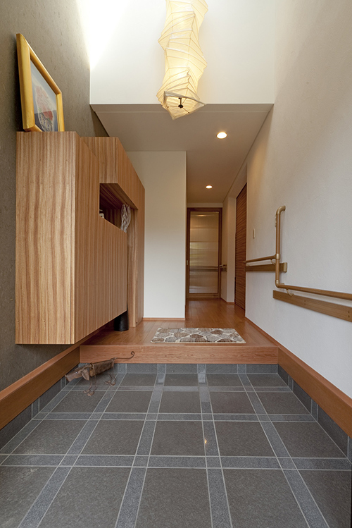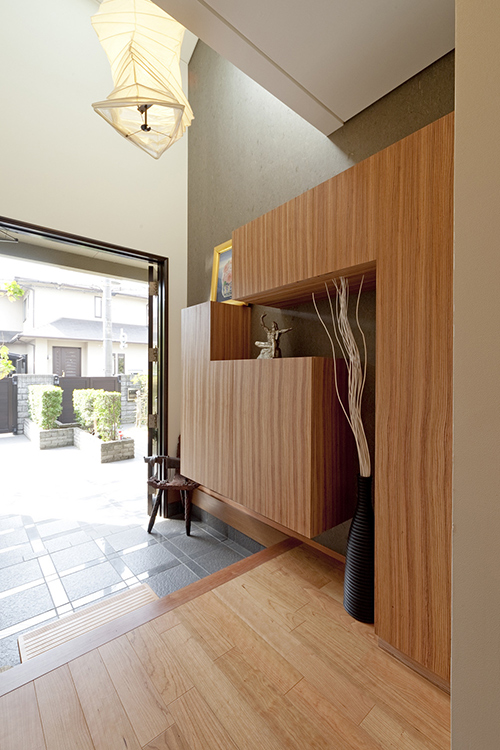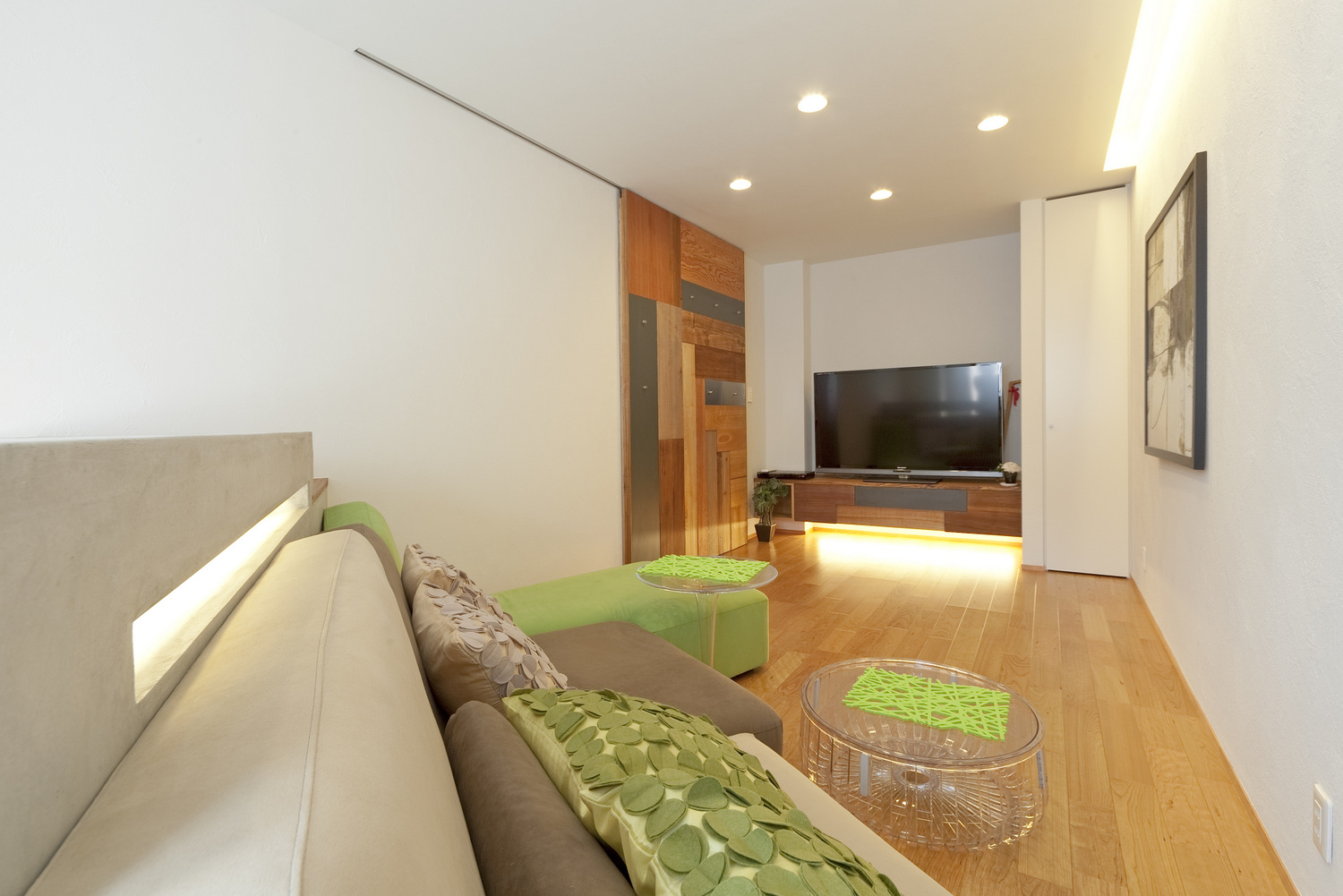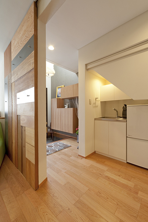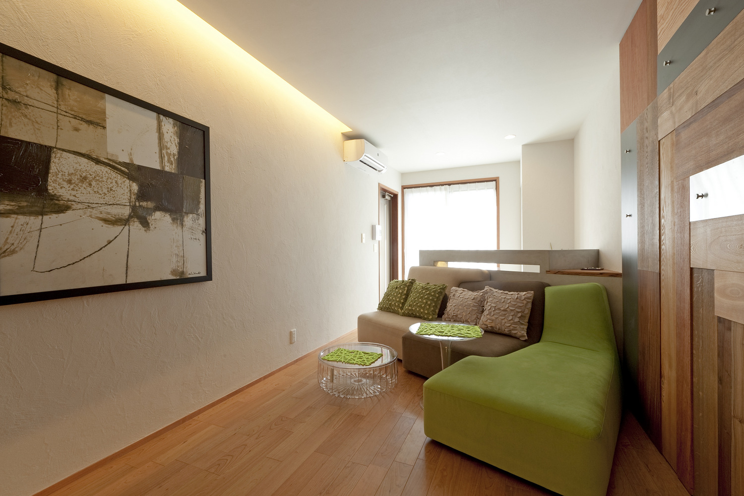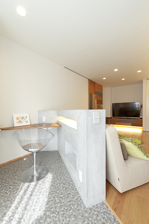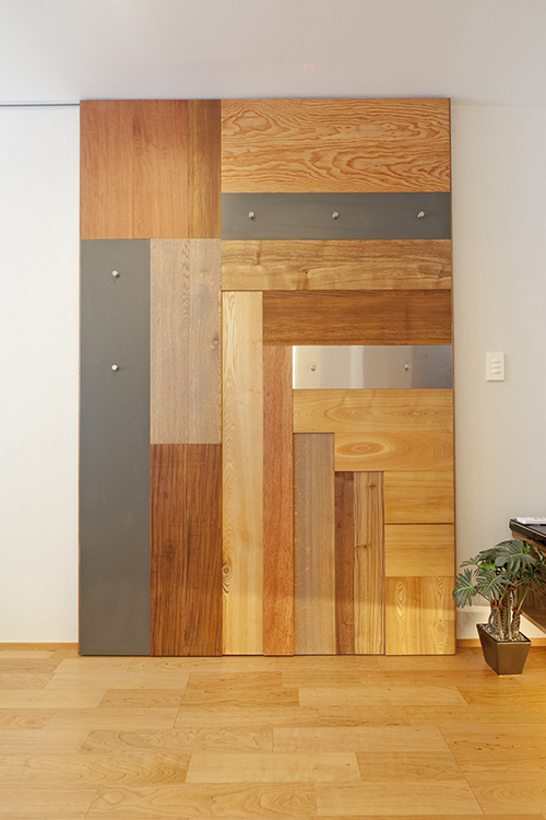 存在感のあるソファが映えるようにと、空間を斜めに間仕切るアイデアで部屋の中心部に配置。その横には、木やメラミン、ステンレスなど異素材を組み合わせ、森をイメージした一枚のアートのような可動壁を造作。アートウォール遊び心のあるサロンが誕生しました。「わかってくれた!という思いが強かったです。」とW様よりのお声を頂きました。