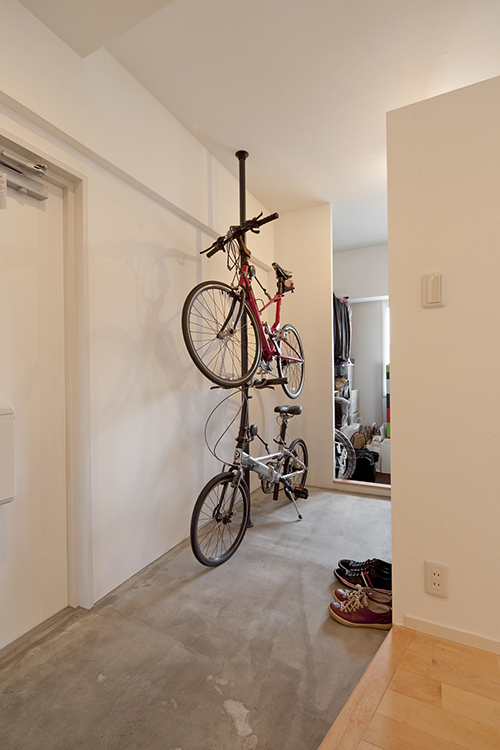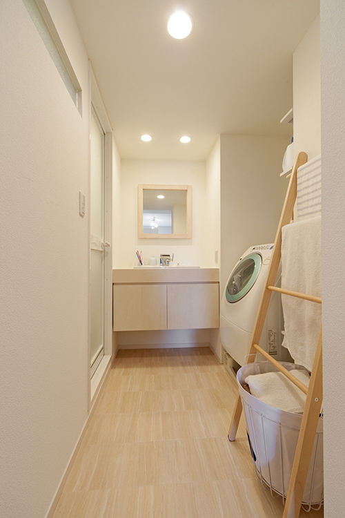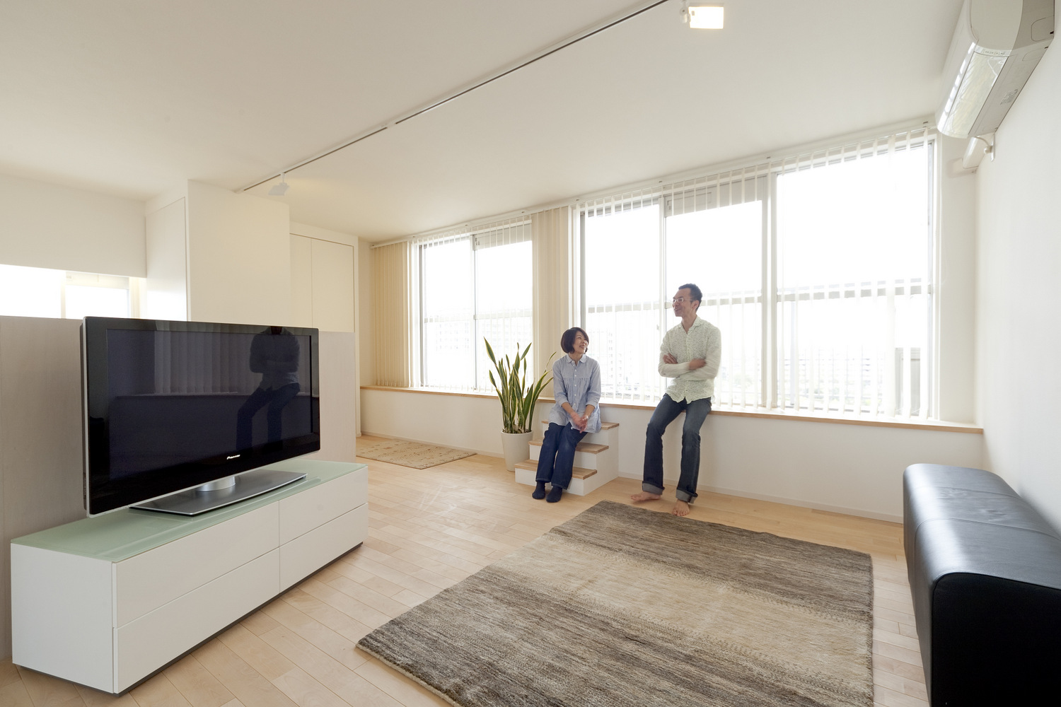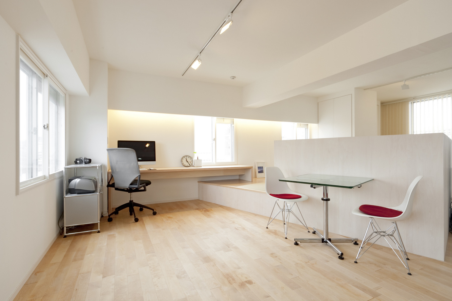 LDKに和コーナーをどこに設けるか。通常ならば角の配置をご提案するところ、海に浮かぶ島のように部屋の中央に小上がりの和コーナーを配置しました。壁側には和アイランドと一体化したPCコーナーを造作。背の低い壁を立ち上げ大空間をゆるやかに仕切ることに成功しました。