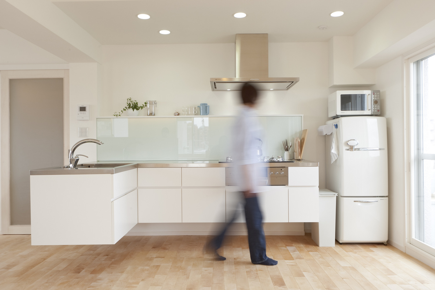宙に浮いたL字型キッチンは、使いやすさもアップ。オリジナルの力作です。