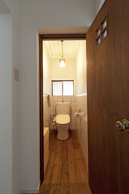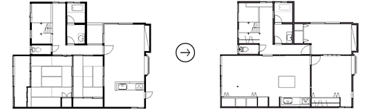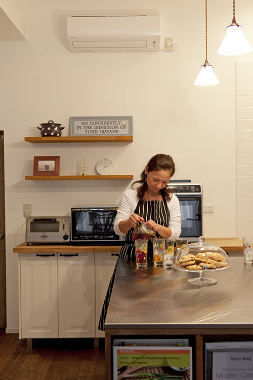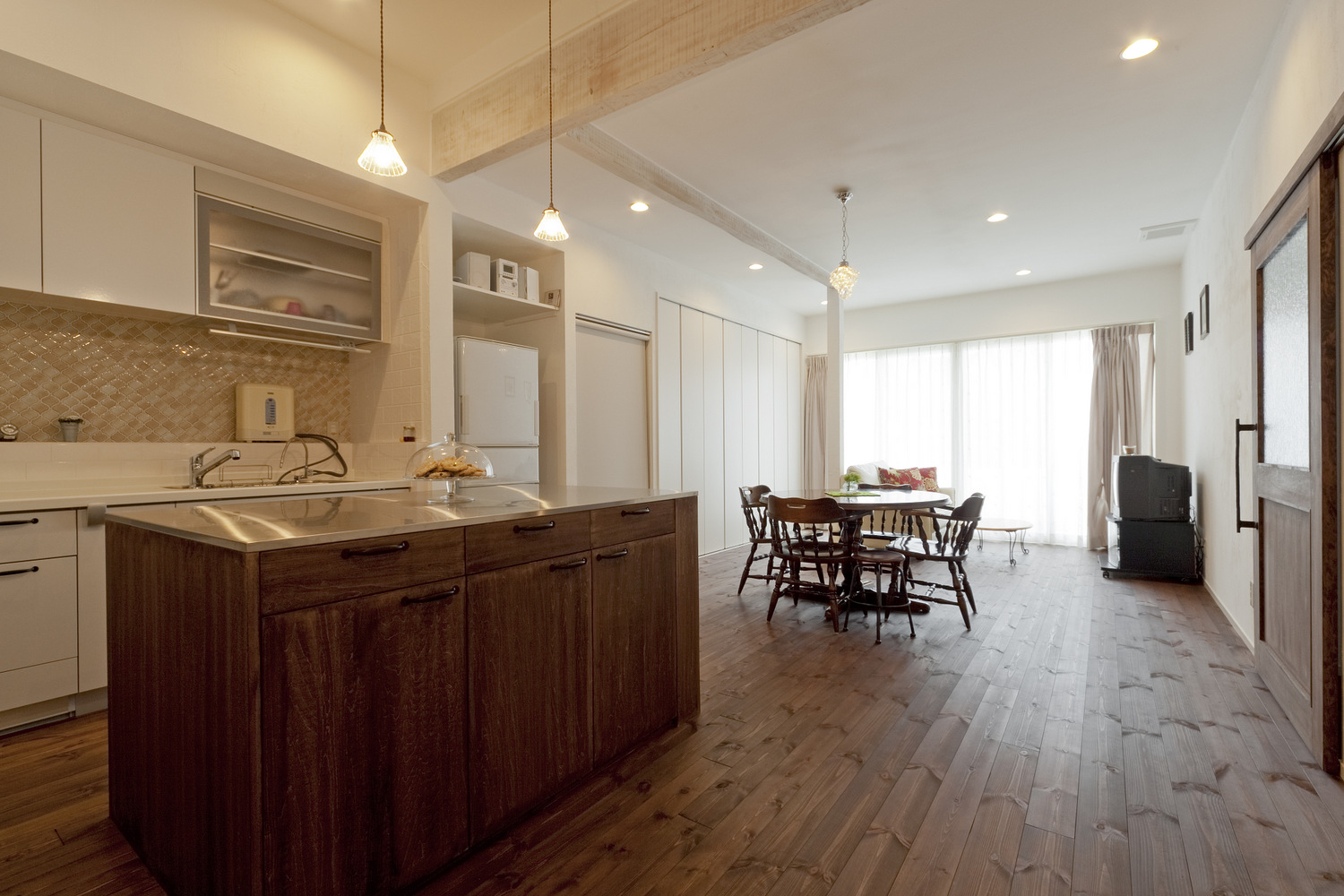 キッチンの配置にこだわり、水が飛び散らないよう壁側にシンクやコンロを集め、人が囲んで料理ができるアイランド作業台をオリジナルで造作。床のパイン材はブラウンに、壁は真っ白に塗装。きれいな丸太梁を、半分見せてシャビーなニュアンスに塗装。白×ブラウンのフレンチビンテージな料理教室が完成しました。