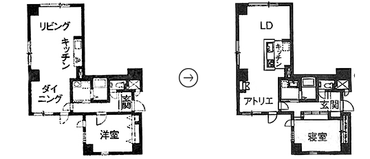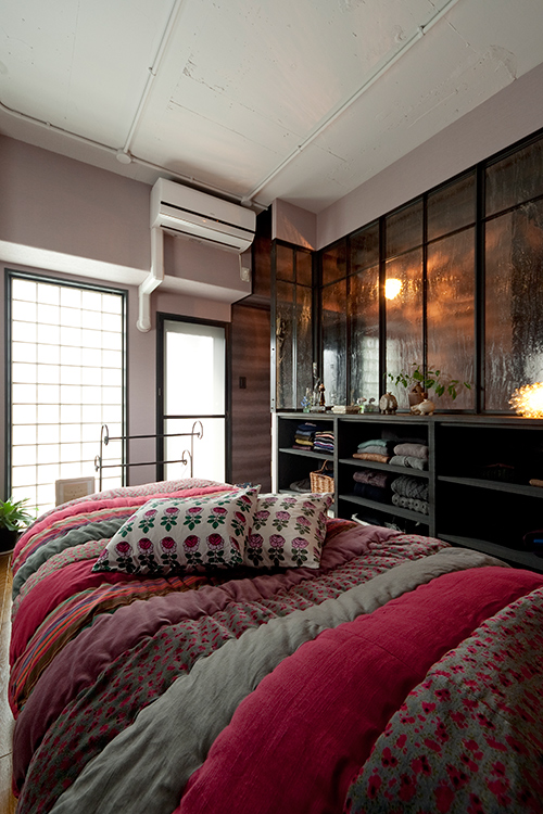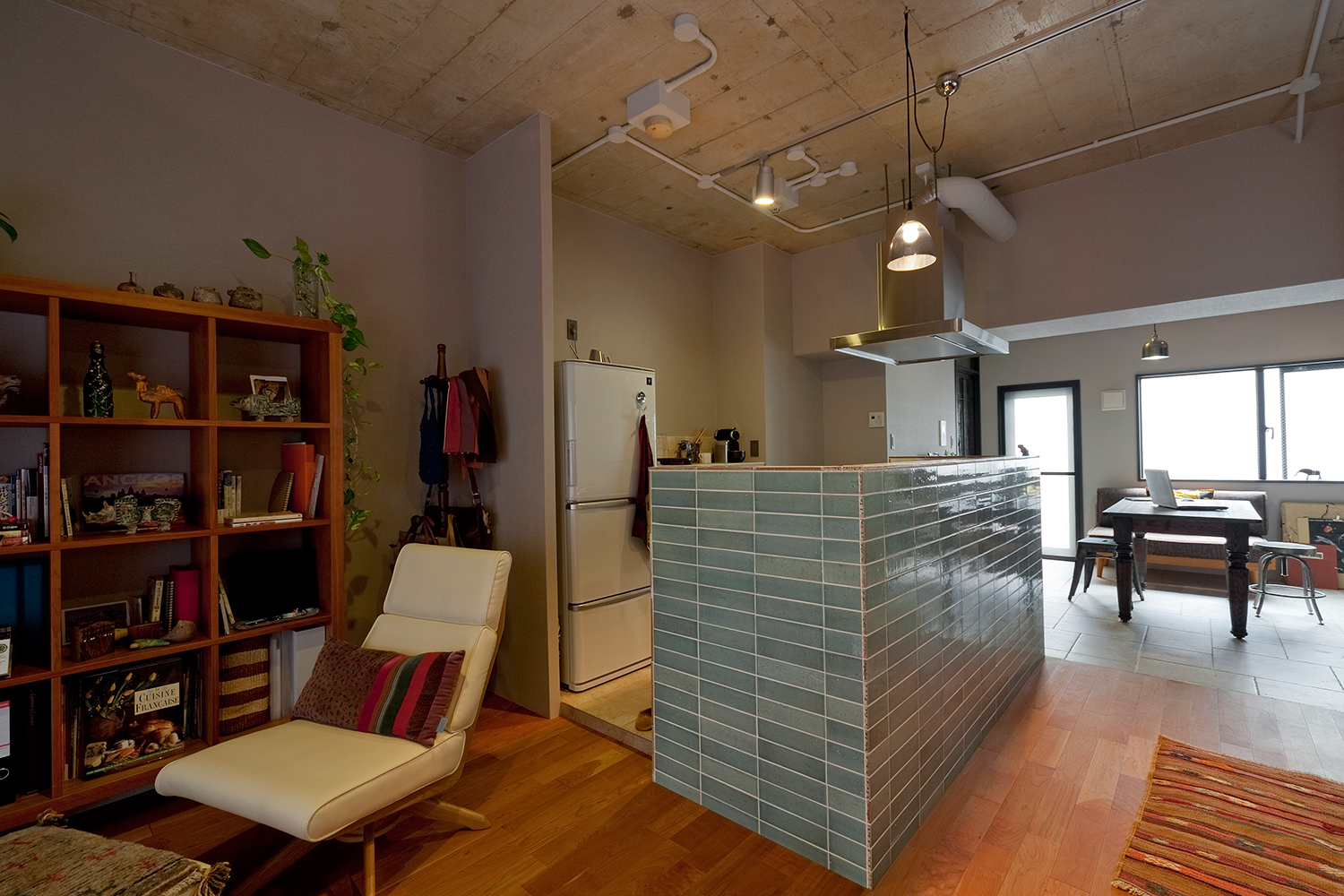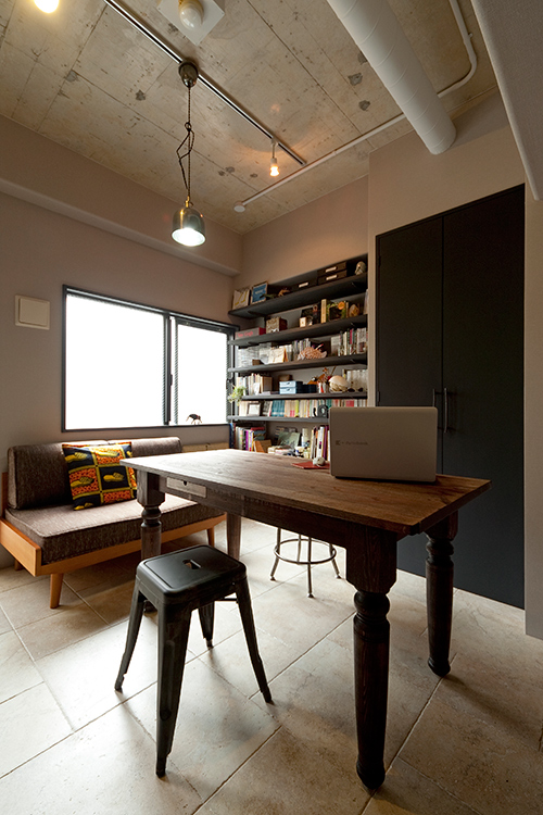 アイアンフレームの灯り採り窓、アトリエから続くLDKは、雑誌の切り抜きイメージされたスケッチを元に再現。タイルだけでも8種類使い、無垢材・アイアン・ガラス・モルタル・レザーと素材のミックス感を演出。洞窟風玄関、無機質なアトリエ、タイル張りのカウンターなど場所によってまったくイメージの異なる空間が誕生しました。