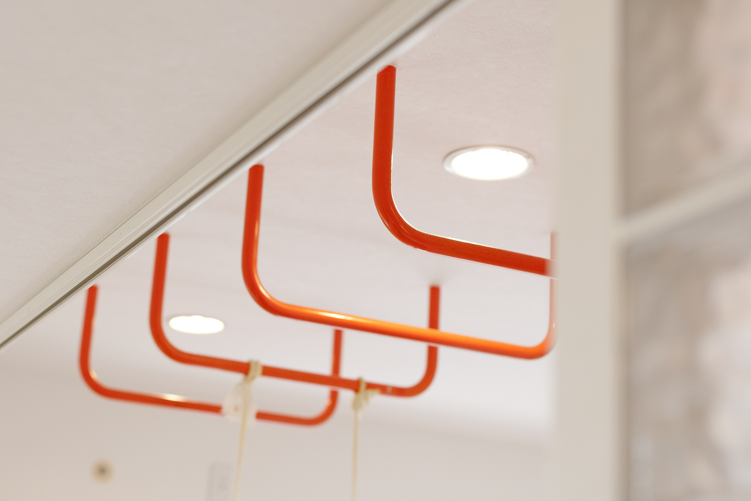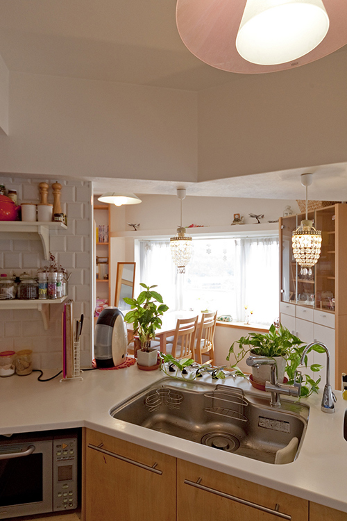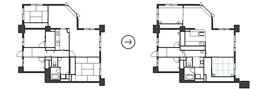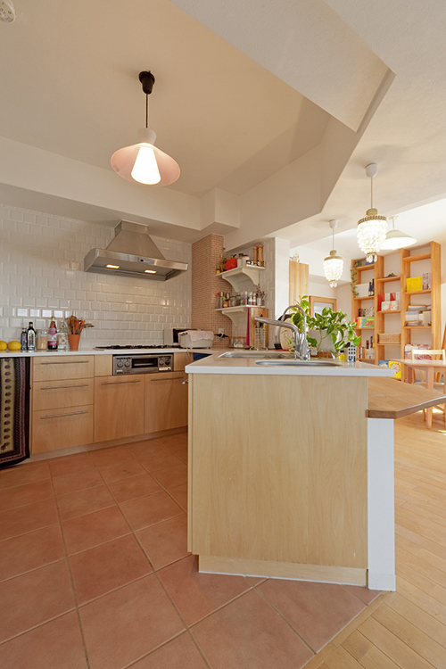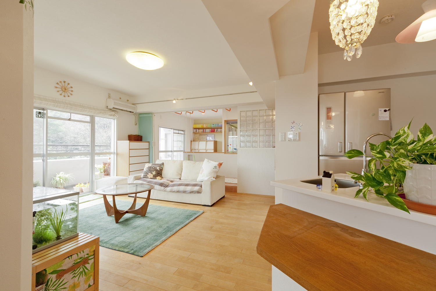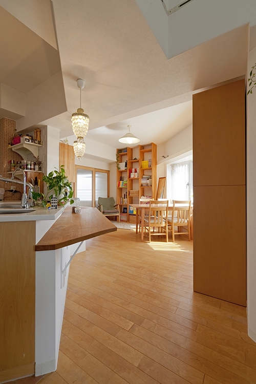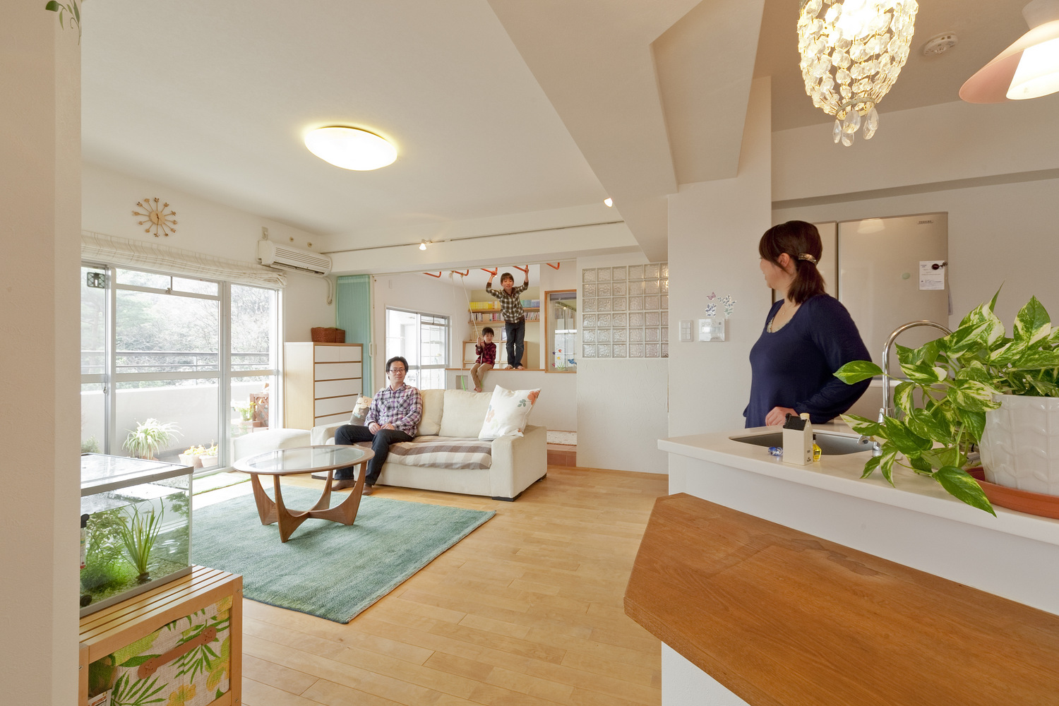 2部屋を除いて壁や天井を取り払い、スケルトンリフォーム。窓の角度に合わせてペニシュラ型のオーダーキッチンを斜めに配置。キッチンの羨望、両側に広がるリビングやダイニングまで見晴らしがよくなった。バルコニー近くに浴室を配置。窓をあけると風が心地いい。雲梯やブランコ、のぼり棒とお子様は大喜びです。