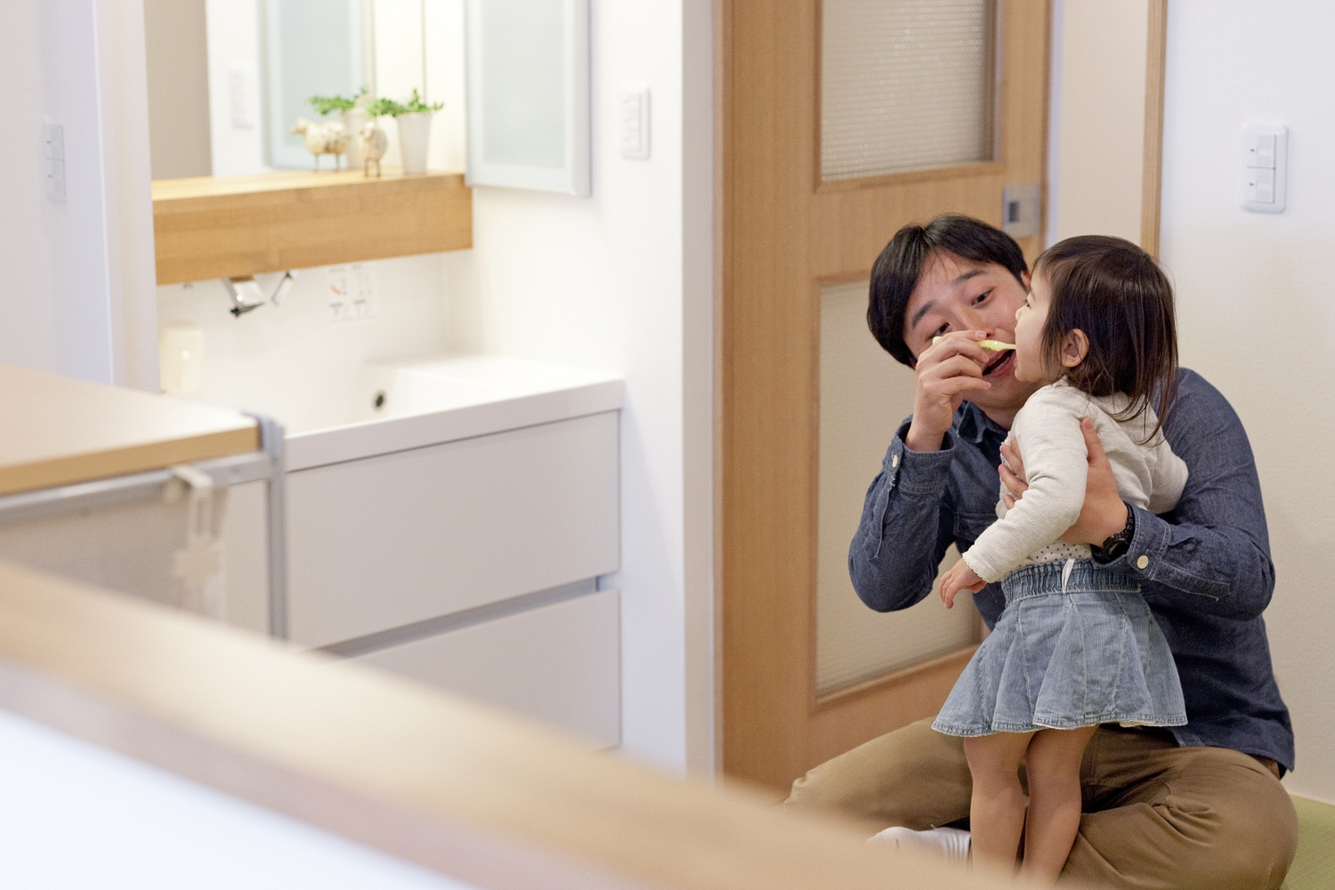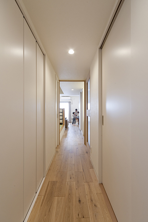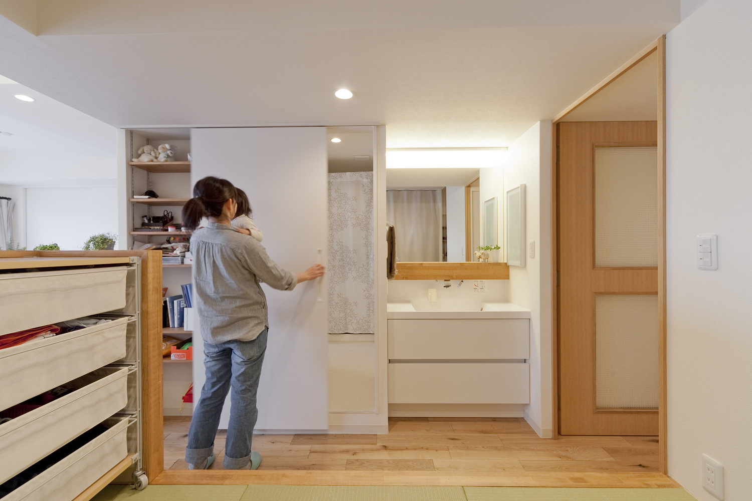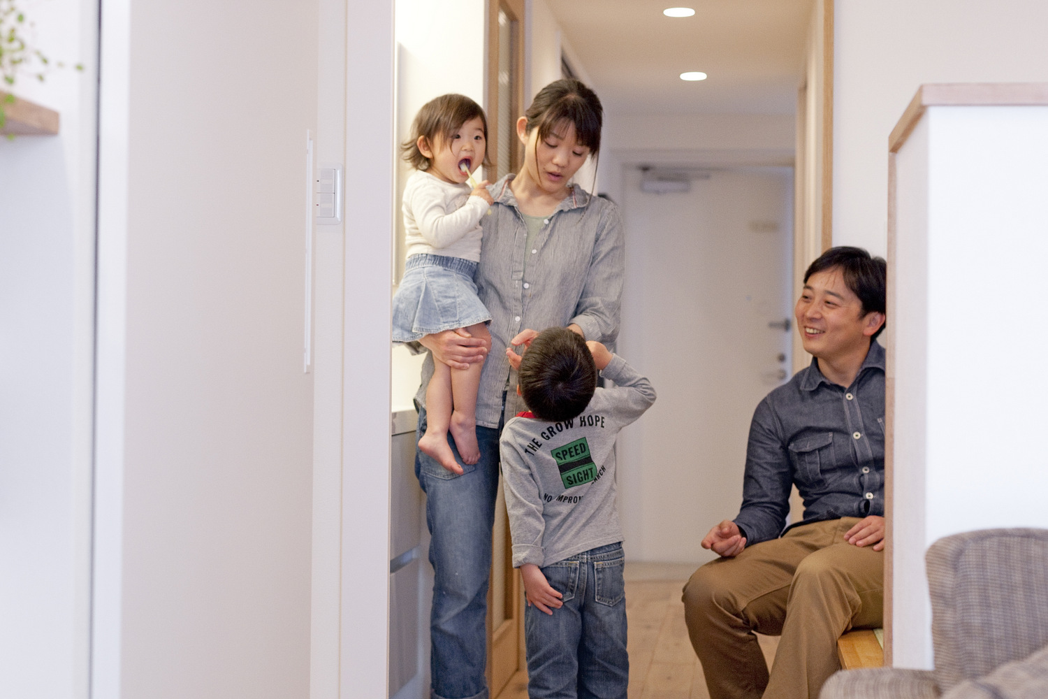 「何事も根拠がないとダメ」が合言葉でした。例えば畳下収納も天井が低くなるのになぜ必要なのかをとことん考え、その結果辿り着いたのが「歯磨きのときに座る役割を果たす」でした。また、「安全に子どもたちが走り回れるようLDKのドアを引戸にしたい」ご要望にスペースの確保が難しく、そこで、防火扉のように廊下の壁に凹みをつくり、ぴたりをハマるよう工夫してリクエストに応えました。