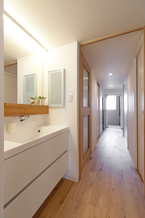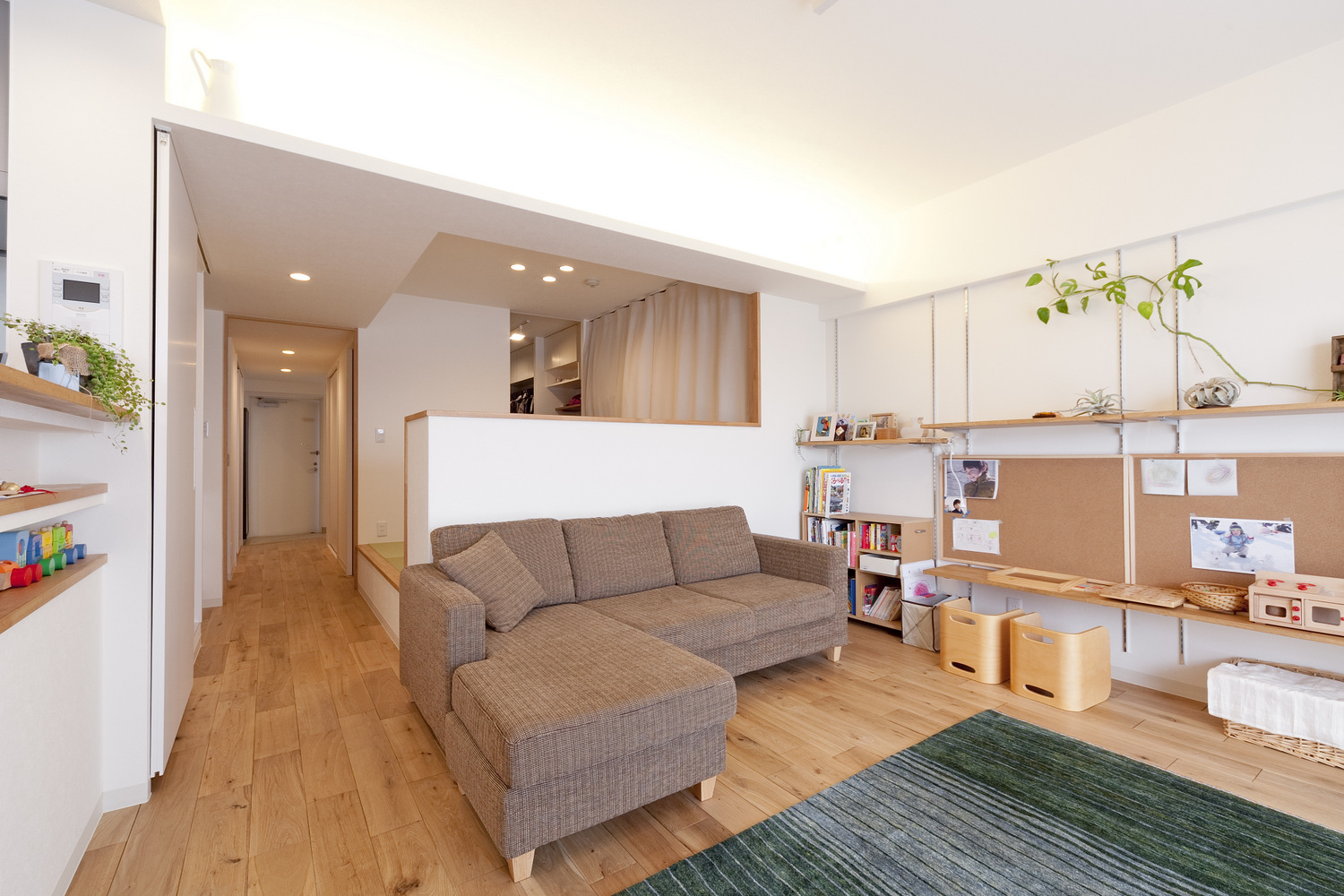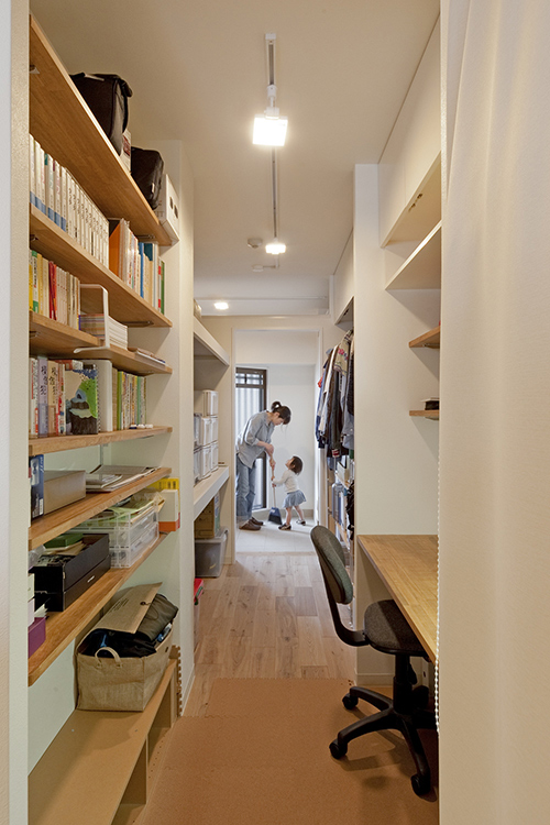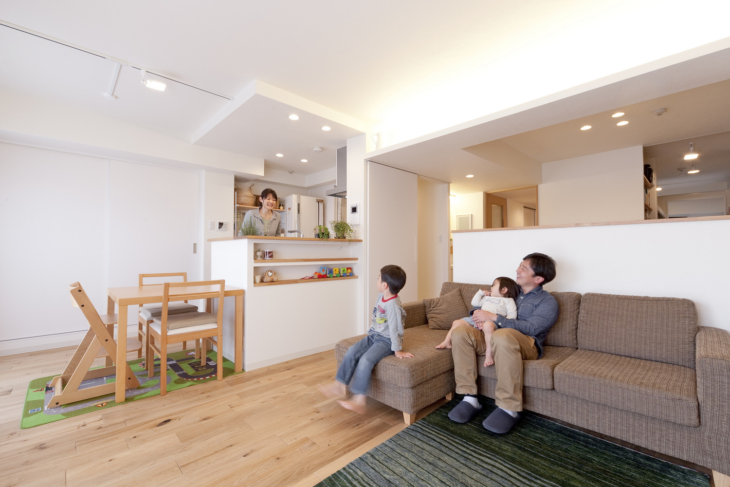 「何事も根拠がないとダメ」が合言葉でした。例えば畳下収納も天井が低くなるのになぜ必要なのかをとことん考え、その結果辿り着いたのが「歯磨きのときに座る役割を果たす」でした。また、「安全に子どもたちが走り回れるようLDKのドアを引戸にしたい」ご要望にスペースの確保が難しく、そこで、防火扉のように廊下の壁に凹みをつくり、ぴたりをハマるよう工夫してリクエストに応えました。