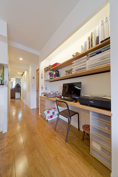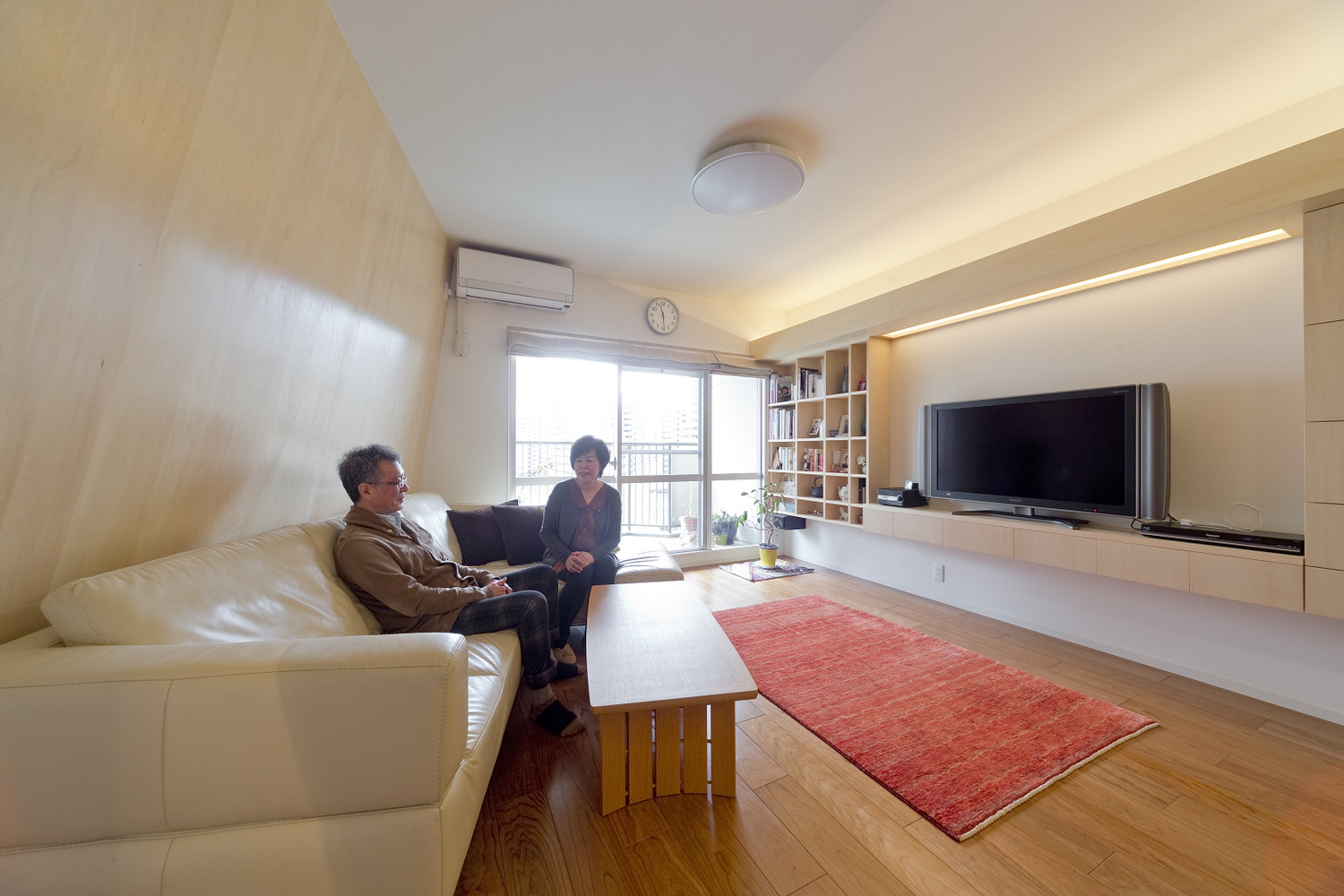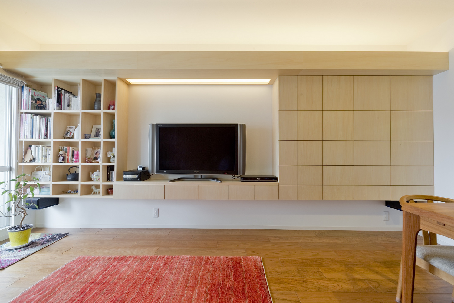 ともすればシャープな印象になりがちな直線の目立つ壁面収納も、シナ材の質感が雰囲気を和らげています。