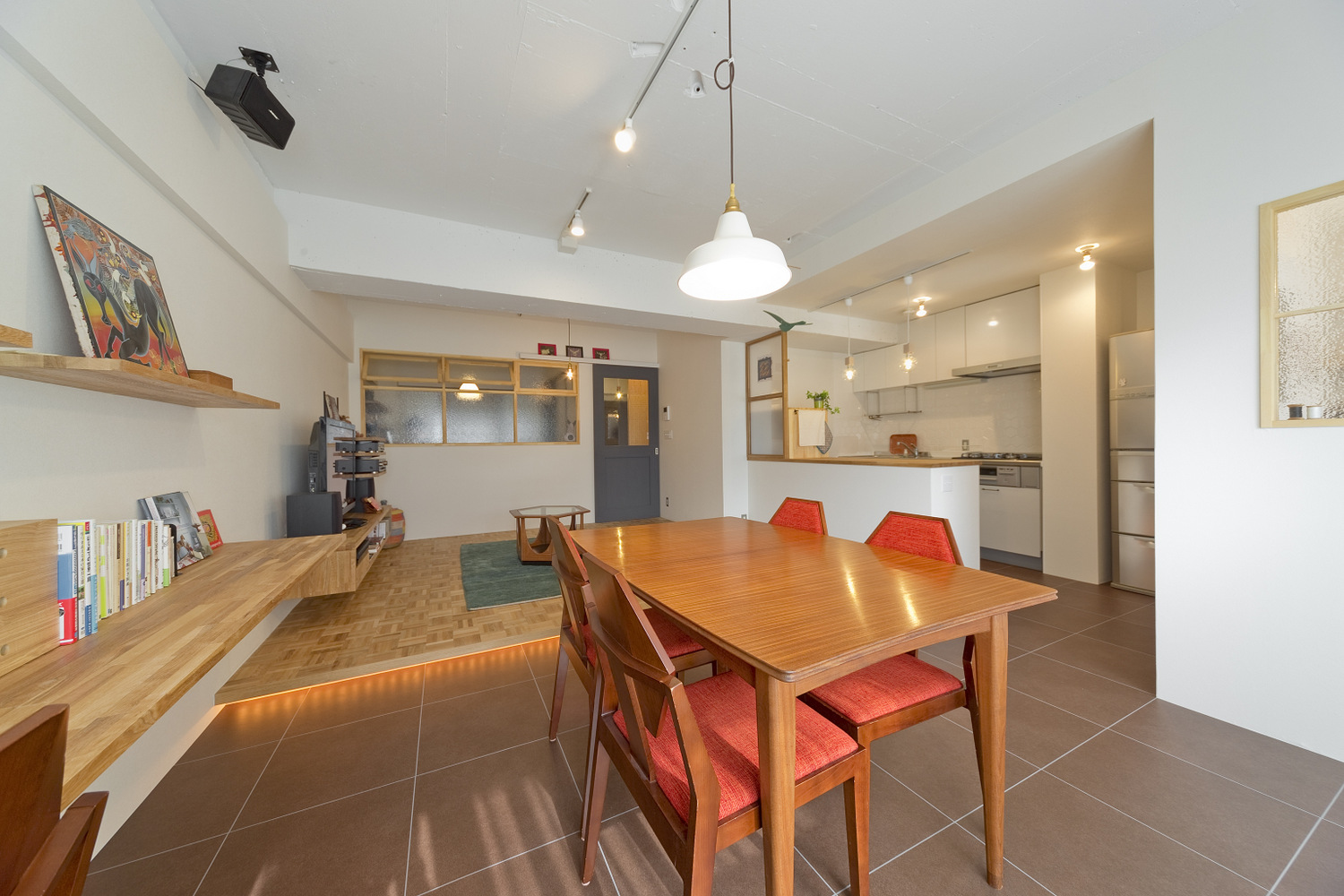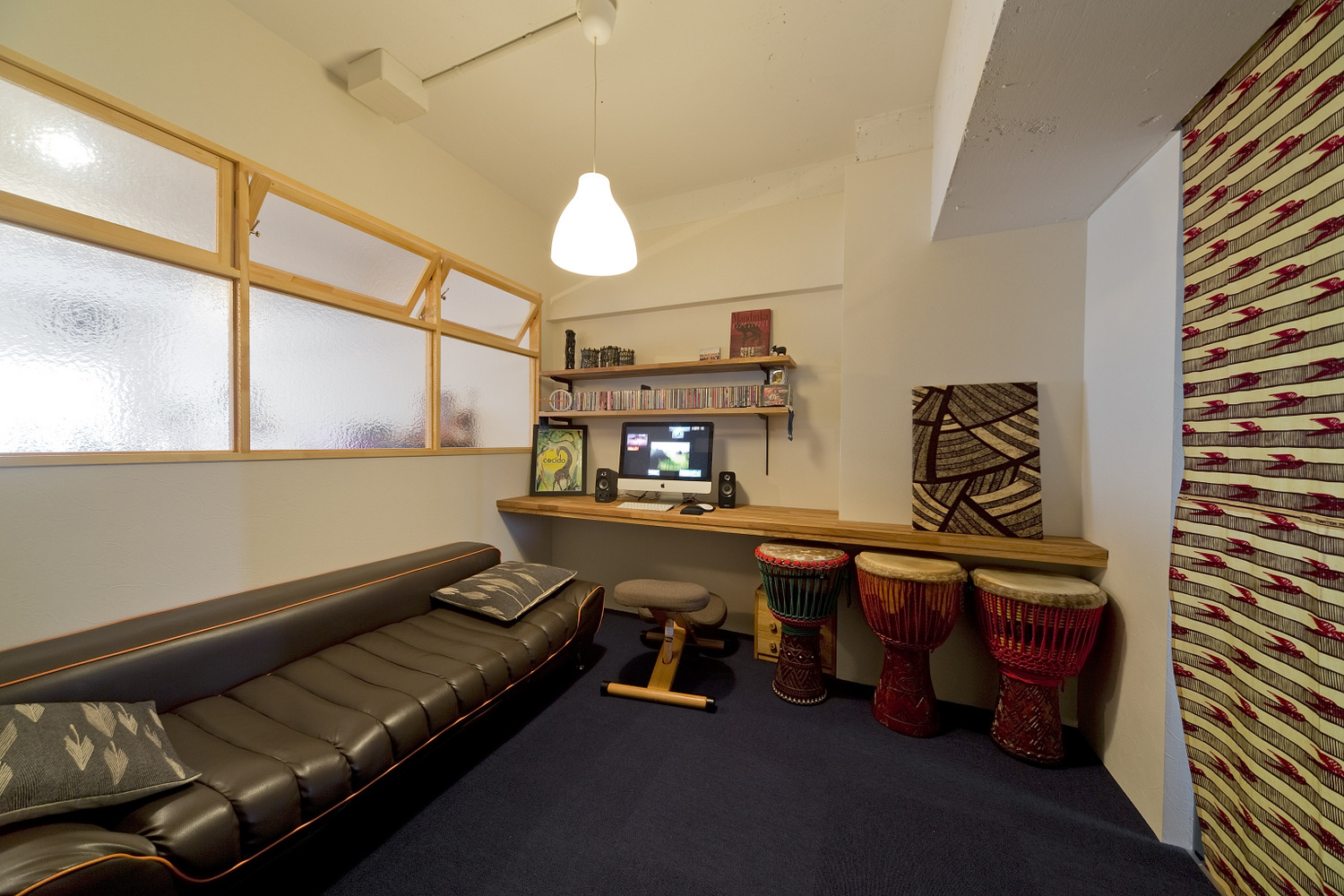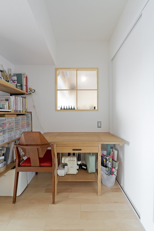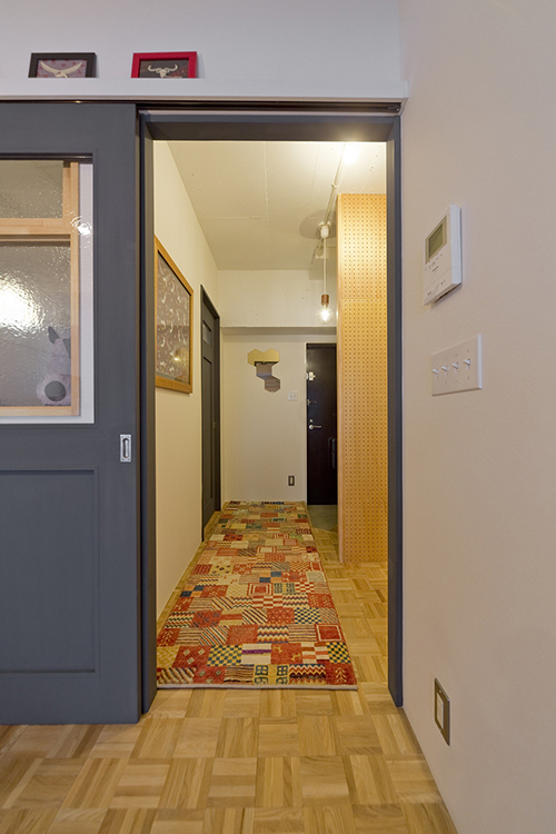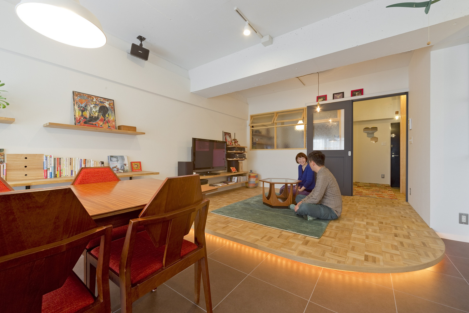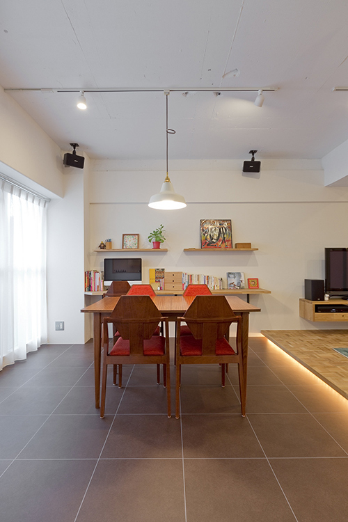 音楽大好きのご主人様と、手作り作家の奥さま。もともと変わった間取りの物件のよさを活かし、干渉しあわない位置にそれぞれの個室を設け、その間にある空間がゆるやかに二人の世界をつなぎます。曲線を描くパーケットフロアのリビングは、段差に仕込んだ間接照明の効果で浮かんでいるようにみえるのが特徴。