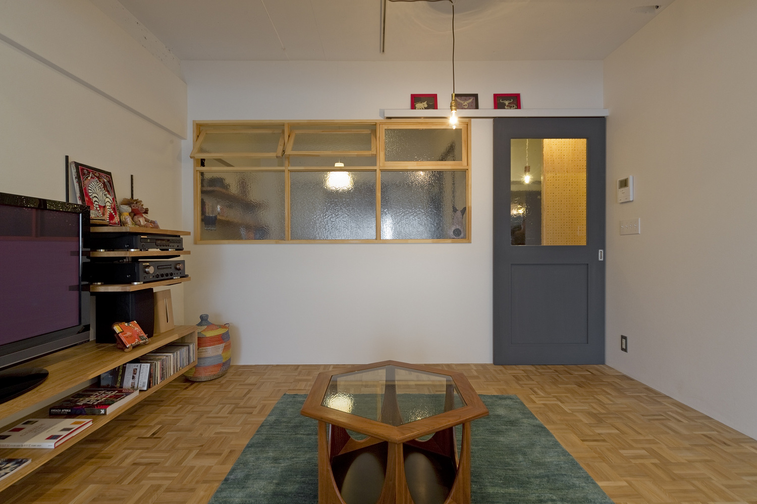 六角形の家具やタイル、雑貨をふんだんに取り入れて、ひとつのモチーフを主体にしたまとまりあるインテリアを構成しています。