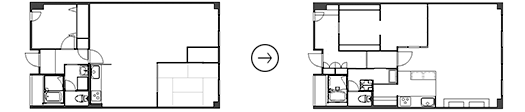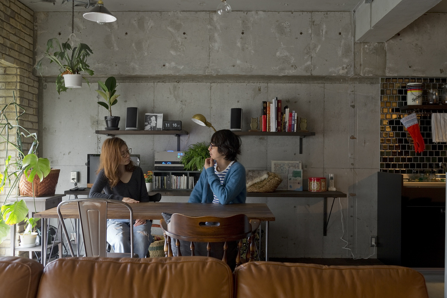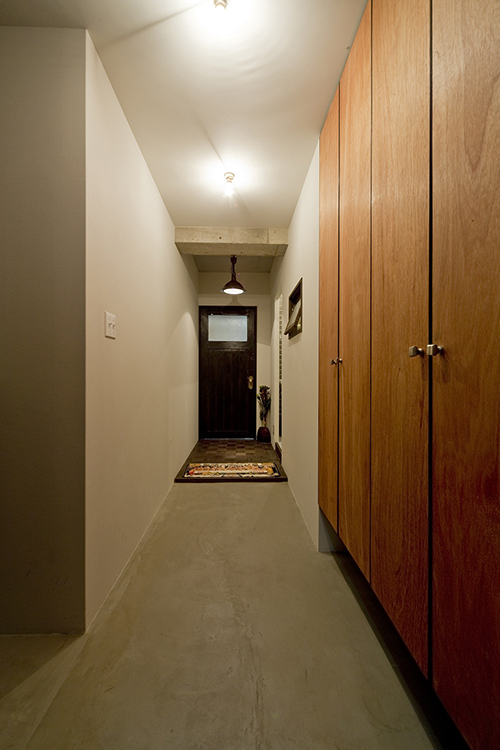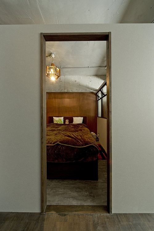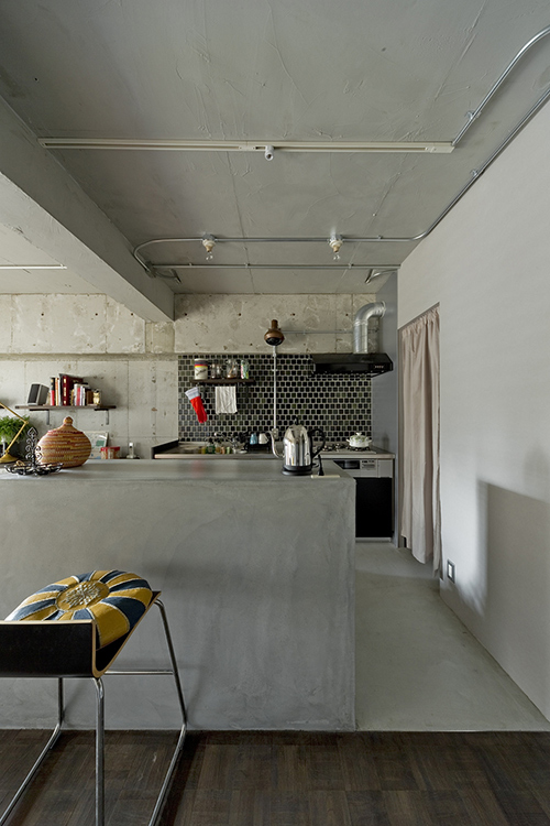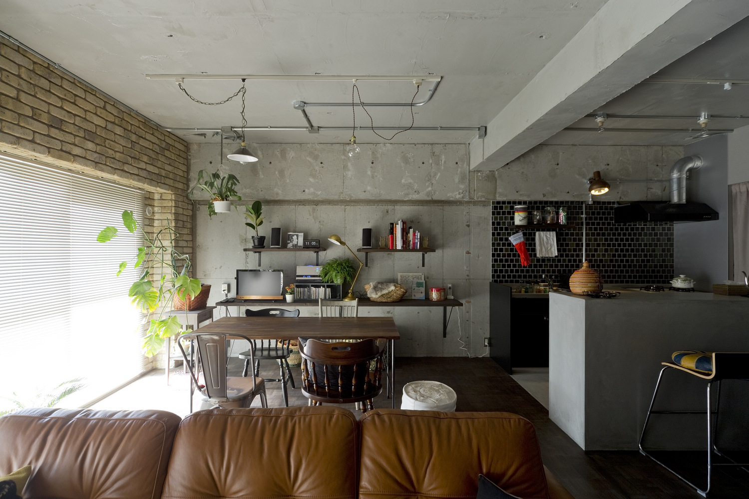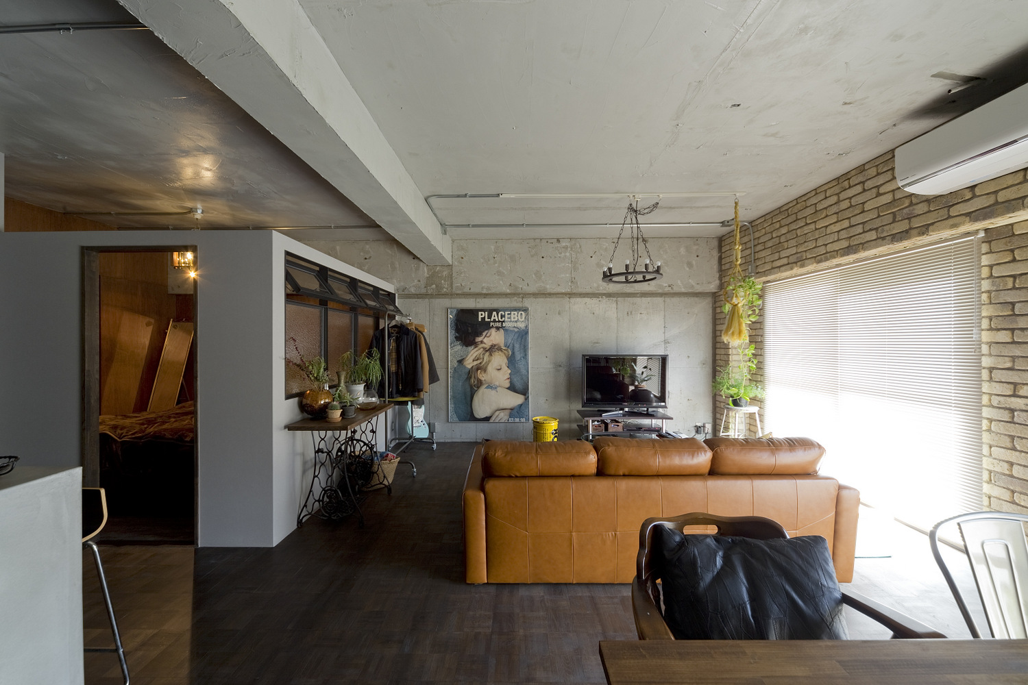 ご夫婦二人暮らしには、広すぎるLDKは少し縮小。白に塗装された剥き出しの天井は上からモルタルで仕上げ、より無機質な空間に。外壁面は断熱を施した上から古レンガを貼ることで、ニューヨークの古いアパートのような雰囲気に。土間に設けた書斎や、リビングから見えない位置に配した冷蔵庫スペース等、ご夫婦の世界観を邪魔しないご提案が喜ばれました。
