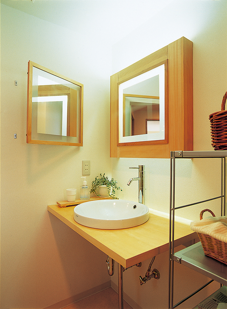 反面、洗面台や鏡はオリジナルで造るなど、こだわるところはとことんこだわっています。特に鏡は、照明をはめこんだり、側面の壁を使って二面鏡にしたりと、奥様のご希望がいっぱい詰まっています。