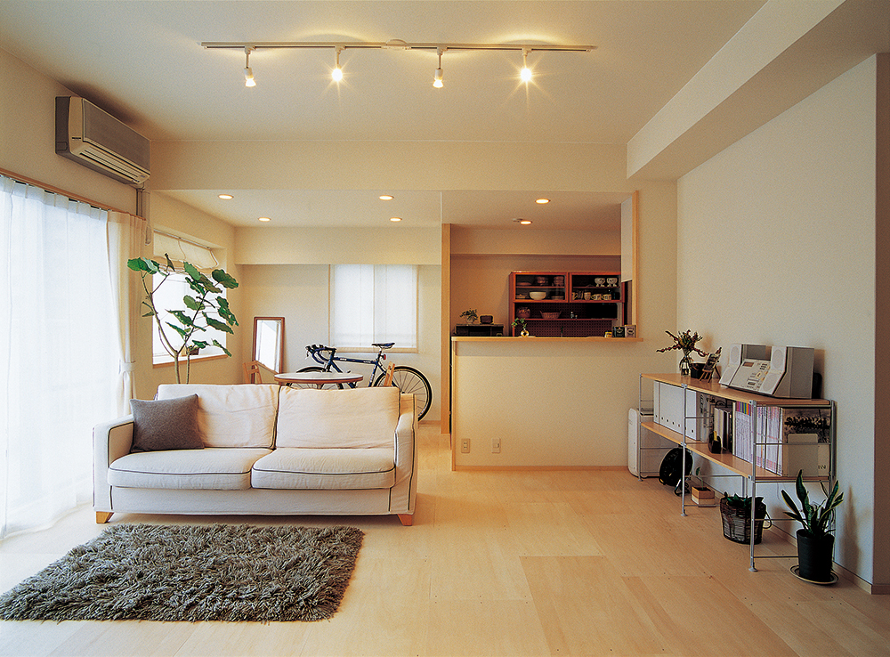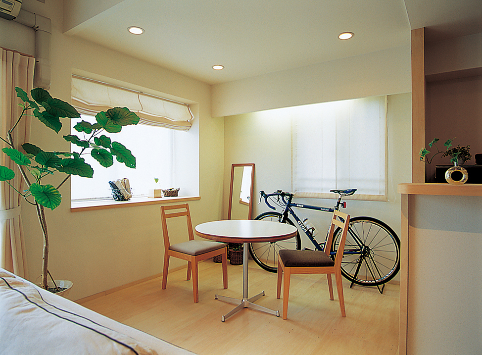 シンプルなインテリアがお好きで、無垢材に興味を持たれていたお客様に提案したのは、幅広のシナベニアを使うプラン。一見シンプルな床に見えますが、すみをビス留めすることで表情をつけました。出窓の天板もシナベニアで化粧直しをすることで、コストを抑えつつ一新。ナチュラルな空間には自転車もよく似合いますね。