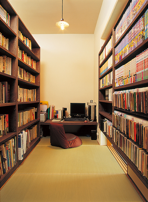 たくさんの本やCDをスッキリ収納できる本棚と机もオリジナルで造作。ほっこりできる畳の細長いスペースが完成しました。