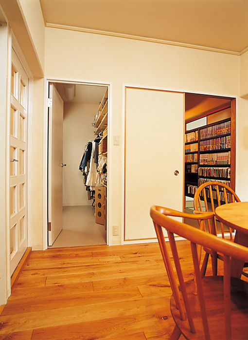 そこで、日の当たりにくいダイニング横の和室に、ウォークインクロゼット・書斎を配置。書斎は両側に本棚を設置しつつも上や下に開口部を設けることで、ベランダからの風が書斎やクロゼットまで通るようになっています。