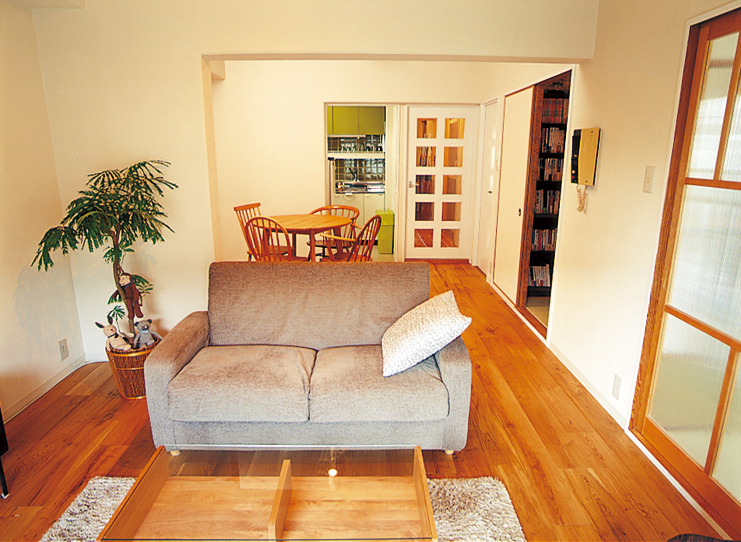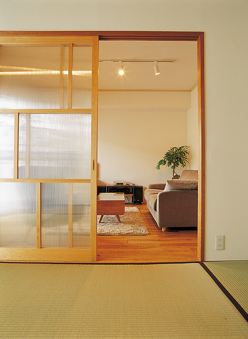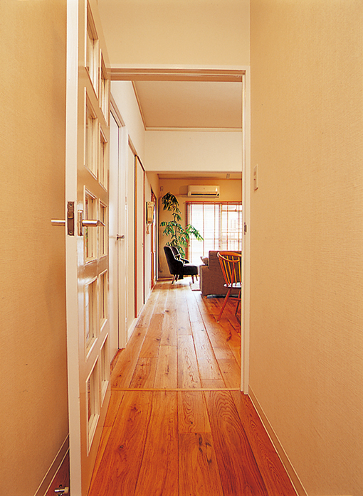 お客様が一目惚れされた節ありの無垢ナラ材を床に使い、リビングと和室を繋ぐ引戸もレトロに仕上げました。