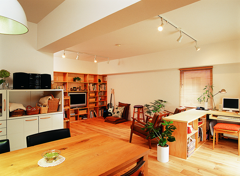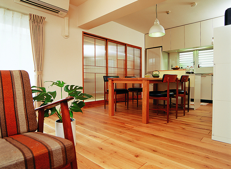 そこで床に採用したのが無垢のワイルドオークです。家具に合わせて選んだ深い色合いの無垢床は、心地よさとともに落ち着いた雰囲気を演出してくれます。さらに、ダイニング横の引戸は、奥様のアイデアを加えて障子をポリカーボネートで再生することで、和室越しに外の光を採り入れられるように。家族みんなで使えるL字型のSOHOコーナーも設け、自然と家族があつまる心地よいLDKが完成しました。