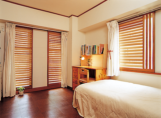 また、本や雑貨をたっぷり飾れるTVボードもリフォームのポイント。実はコレ、子供部屋の壁にもなっています。子供部屋にする部屋は、元はリビングと続き間の和室。「独立した子供部屋がほしい」を叶えるため、開口部に合わせてTVボードを造作し、すっぽりはめ込むことで壁をつくりつつコストダウンにも成功しました。洋室に生まれ変わった子供部屋は、和室だったころの障子をルーバーにつくり変え、レトロモダンに仕上げています。