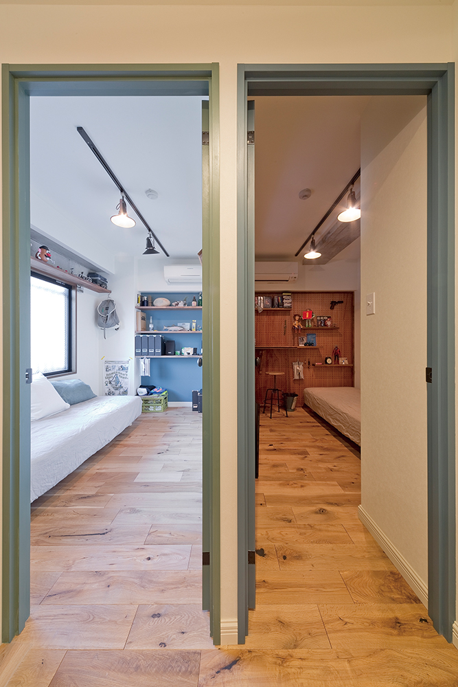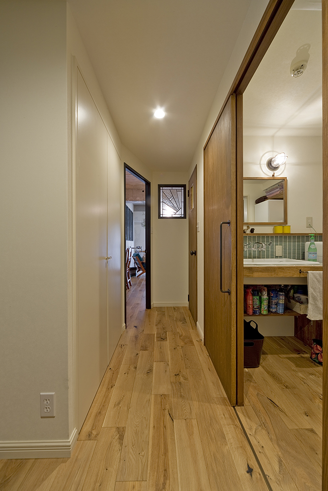 さらに、すべての床材をオーク材で統一したのも、広く見える工夫のひとつ。各部屋が狭いため、それぞれ床材を変えてしまうとどうしても狭い印象になります。統一することで、扉を開け放つと1つの大きな空間になり、広がりを感じられるように仕上げています。