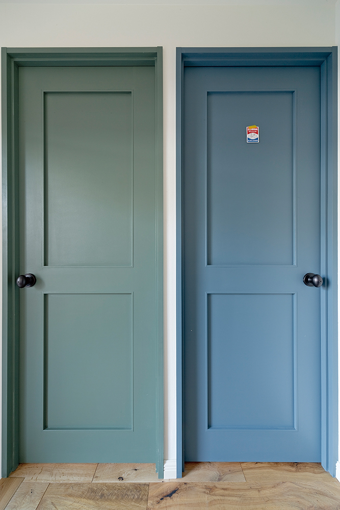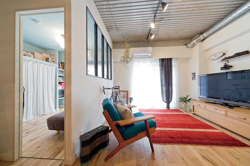 個室を最小限の広さに抑えた分、諦めていた共有部分のLDKと玄関を広げることができました。ご夫婦の寝室も、大きな開口×ヴィンテージドアで、ダイニングからつながるアトリエのように使える面白い空間です。