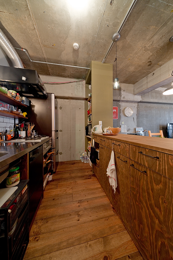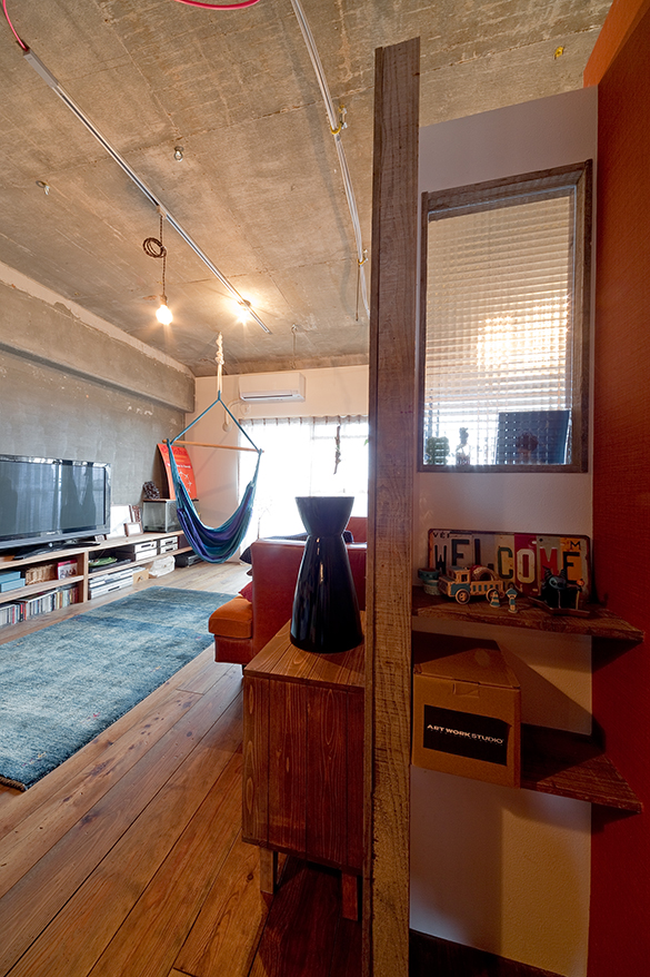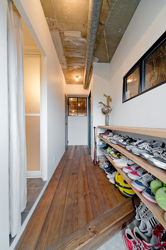 みんなが集まるLDKは「アメリカンヴィンテージ」をテーマにチョイスしたボルドーパインの無垢床や剥き出しの天井、足場板を使ったシェルフ、アイアンなど、素材使いも気に入っていただけました。