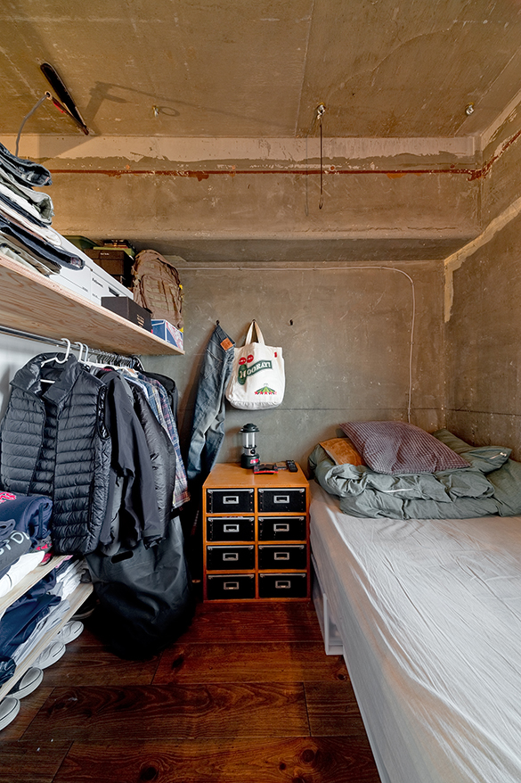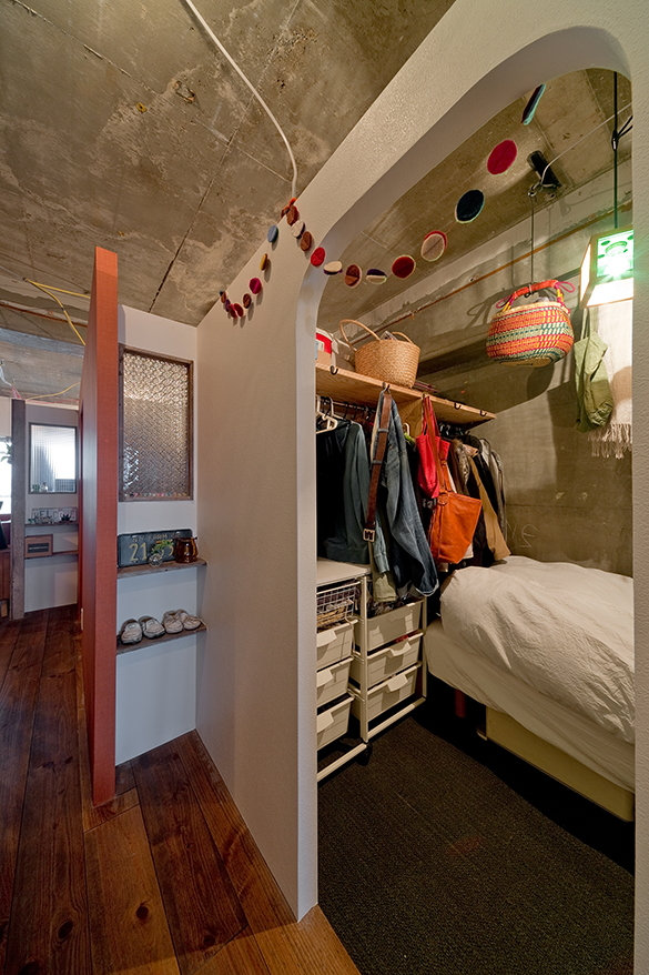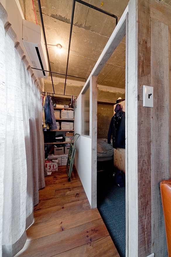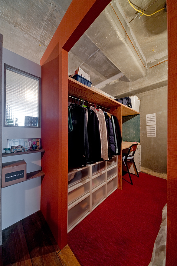 エアコンを共有することから壁は低くして天井をつなげ、壁は杉の古材に赤・白のクロスと、素材や入口のカタチ、高さを変えることで、表情豊かな「家族4人のシェアハウス」が完成しました。