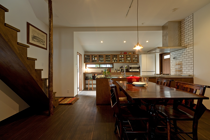 1階DKは天井や壁を抜いた大空間。床はパイン材をダークブラウンに塗装し、新設した階段には丸柱を添えました。この丸柱は木登りスポットとしてお子様たちに大好評。奥様たってのご要望でオープンキッチンや収納棚もオリジナルで造作。正面に和室、庭へと視界が広がるキッチンは、「ここから眺める庭が大好き」と、とても気に入っていただけました。