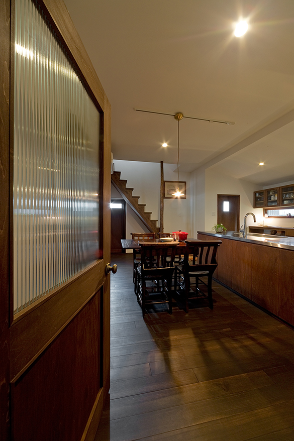 築80年の日本家屋をリノベした一軒家です。「レトロ」が好きなお客様のために、趣のある和室の板張り天井や畳はそのまま、漆喰・無垢材・ガラスといった日本の伝統的な建築素材を使い、ダークブラウンでコーディネート。お手持ちのアンティーク家具に合う和モダンに仕上げました。