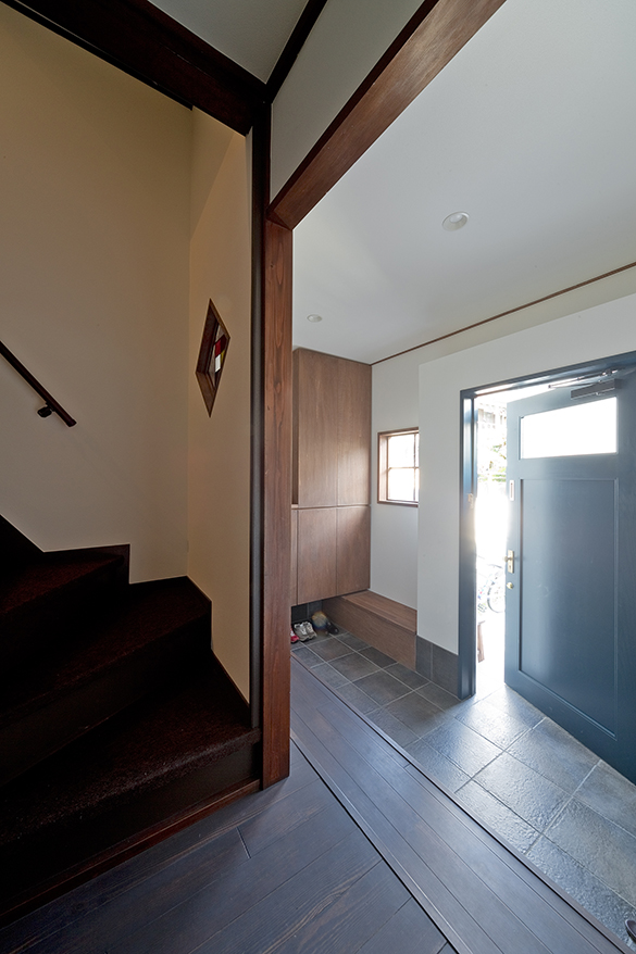 刷新された玄関回り。ペイントで仕上げた洋風開き扉が入ることでレトロな木部がも引きたちます。