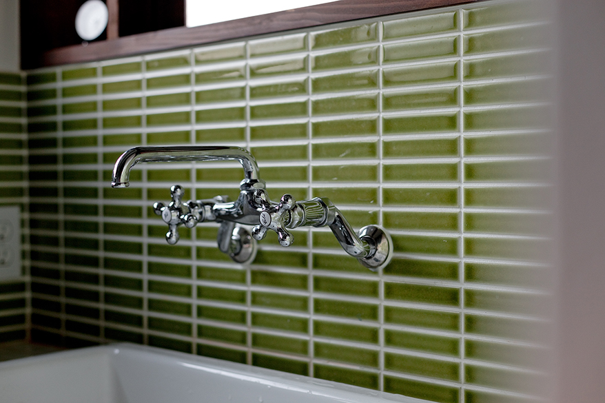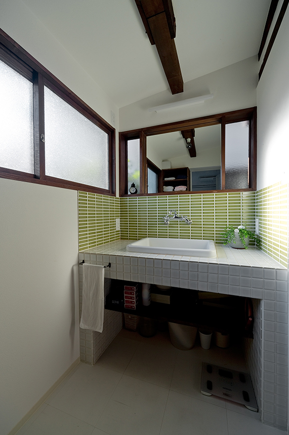 外部の窓との納まりも入念に考えたレトロタイルが可愛い洗面台。