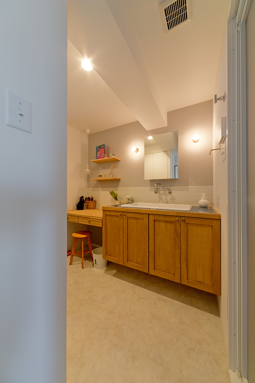 奥さまこだわりの洗面室は、くるりと回遊できる2WAY仕様。収納たっぷりの洗面台には化粧用ライト、隣にはアイロンがけもできる作業スペースをオーダーされました。