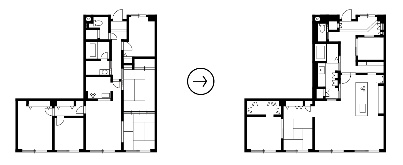 お子さまが巣立つと、家の間取りであるとか生活スタイルとか。これからの人生を見直す時期がやってきます。Mさんもそう。前より少し大きめな中古マンションを購入し、「ゆったり、おいしくお酒が呑める家」をテーマに、大胆にリノベーション。どの部屋も明るくて風通しもいい。「友人もたくさん集まるようになりました。ほめてもらうとうれしいですね」と奥さま。LDKを見ればわかりますが、「ゆったり」とした空間構成がポイントとなっています。