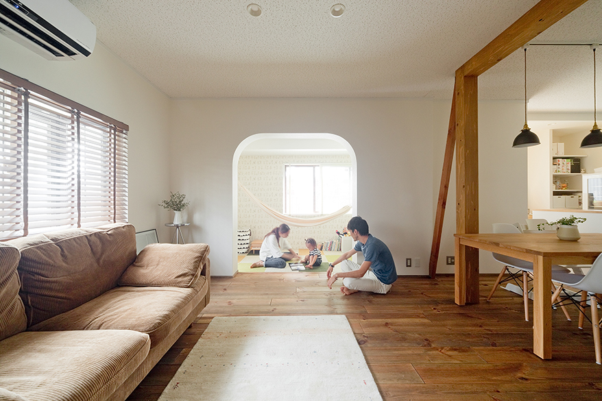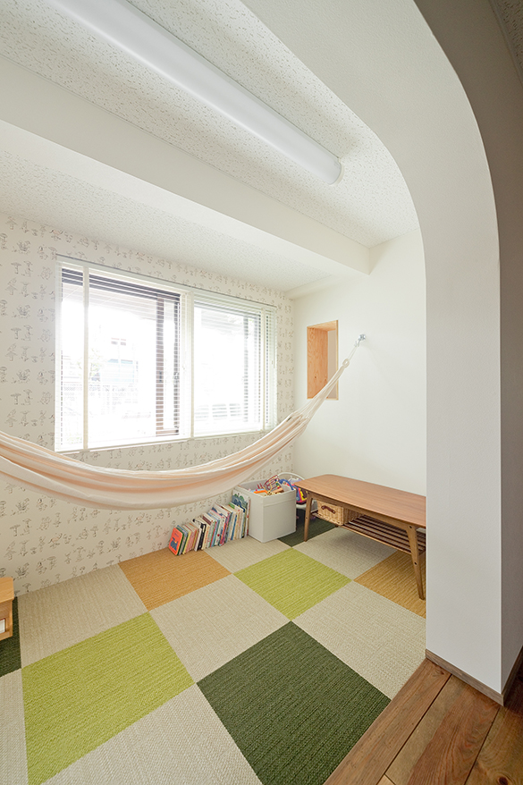 「どうせなら、昔の駐車場の方がよかったのに」。増築したピアノ教室は中途半端で使い道が見つからず、最初はネガティブなイメージしかありませんでした。そこで提案したのが、この「Rでつなぐ」アイデア。完全な個室ではなく、LDKの延長ながらも、離れ的な感じ。子供が遊ぶ様子を見守れて、仲良し親子の距離感にぴったり。壁紙や床材をポップに仕上げたことで、Rのフレームにおさまる感じも素敵です。「ここは僕のお気に入りの場所。子供が大きくなったら、絶対僕の書斎にします!」ともくろむご主人。