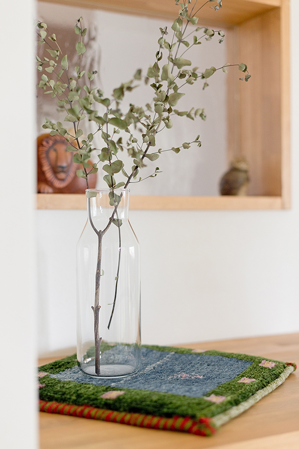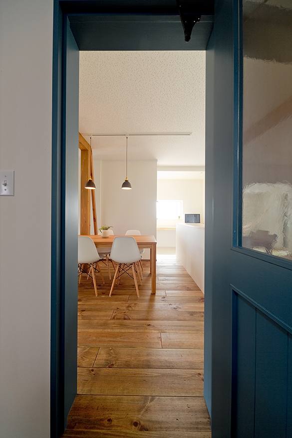 家事室は、もともとキッチンがあった場所ですが、ダイニングやリビングが見えないのがイヤで、キッチンをLD側に大移動。収納たっぷりのキッチンカウンターを作り、二型キッチンとして活躍中です。キッチンからの見晴らしを考えて、構造上必要な壁を抜き、筋交いと梁で補強しつつ、デザインとして成立させました。床材はボルドーパインにブロンズ塗装をほどこし、素材感を楽しむYさん。大好きなブルーグレー色は壁やオリジナルドアに使っています。