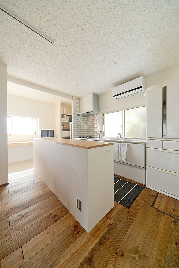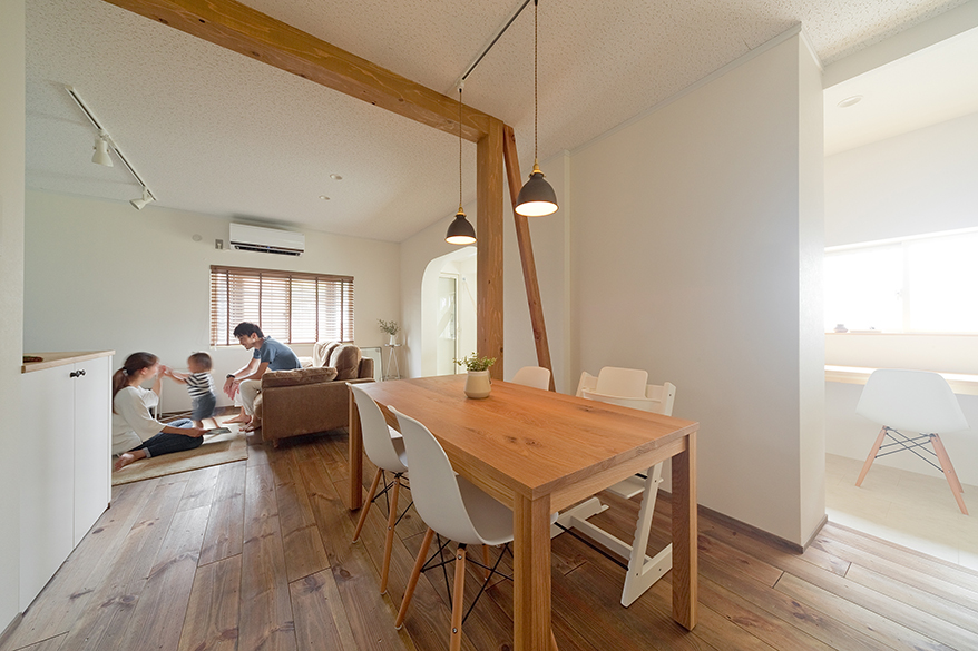 最後までYさんが悩んだのがキッチンの配置。壁付けキッチン+収納兼カウンターにすることでお料理に集中しつつ、振り返ればダイニング・リビングが見渡せます。今まで壁の中に隠れていて色白だった柱と梁は、フローリングに合わせて塗装し、空間に馴染ませました。くつろぐ・つくる・しまう、を1階にぎゅっと凝縮した事で暮らしやすい家に替わりました