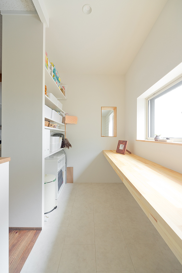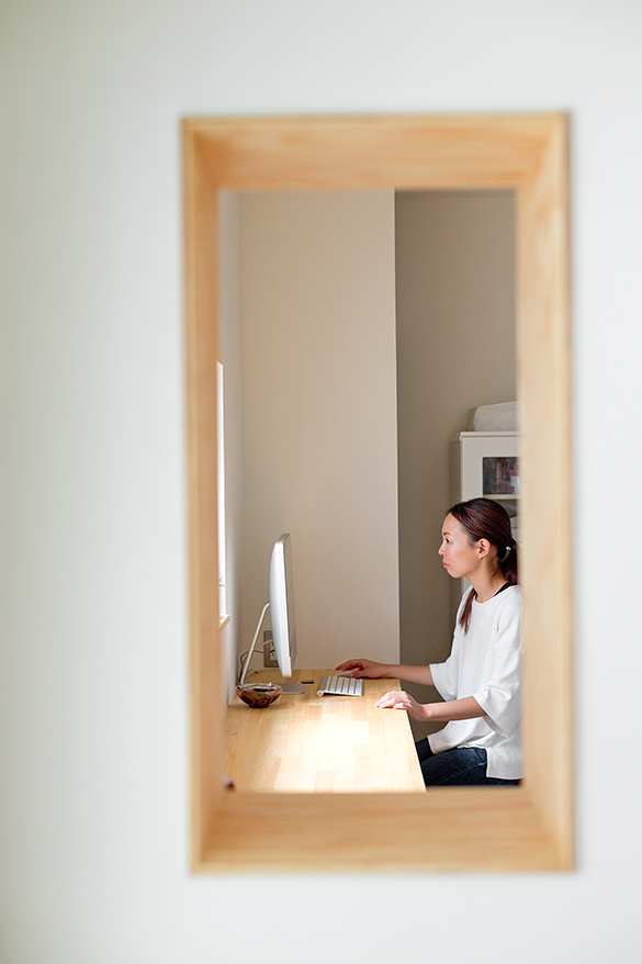 そしてもうひとつ。子供室と「小窓」でつながっているのが、家事スペース。この小窓はもともと駐車場が見える窓だったのですが、ピアノ教室に改装した時にふさいでいました。それをまた開けて、灯り窓として復活。家事室につくった作業デスクに座って横を向くと、小窓越しに子供の顔が。反対側から「ママー!」と語りかける日も楽しみです。