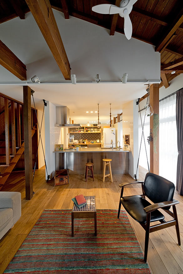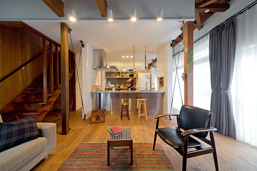 築43年の日本家屋をリノベーション。Wさんが一目惚れしたという、サンワカンパニーのステンレス製キッチンカウンターを中心に、床はシンプルなオーク材、壁はタイルや真っ白なクロスを使い、70年代当時の面影を残す木製階段や、三角屋根のカタチそのままの現しの天井、梁は意匠として取り入れました。1点モノのアートギャッベ、妹のプレゼントだという黒のヴィンテージチェアもぴったり。ちょっとレトロなおうちカフェの誕生です。「キッチンまわりはスケッチを描いてもらっていたのでイメージどおり。シンプルなタイルもお気に入りで、オリジナル収納もたっぷりつくってもらいました」。
