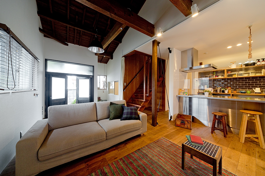 戸建てはマンションよりも自由度が高いので、実家やガーレジからの動線を考慮し、玄関位置を大胆に移動。それにともなって、キッチンやトイレの位置も変更し、大きくなった浴室は玄関側に小窓も設けました。外観は築40年の趣に合わせて2面だけ焼杉を貼り、残りは塗装し直しています。耐震診断の結果から耐震補強もほどこしましたが、重たい瓦を取り除くだけでもだいぶ耐震性能は高くなりますね。