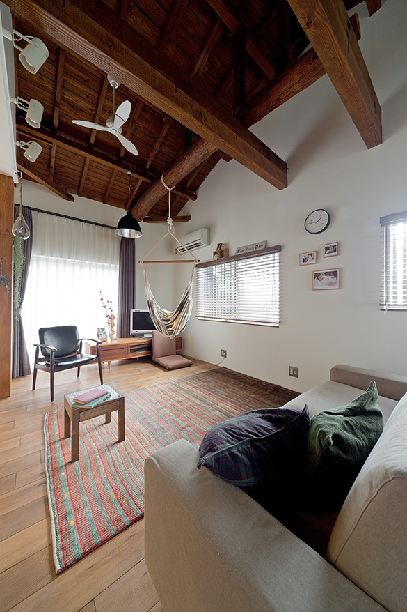 床に無垢のオーク材、壁に真っ白なクロス、現しの天井や梁、柱は塗装で仕上げた開放的なリビング。立派な梁だからハンモックも問題なし