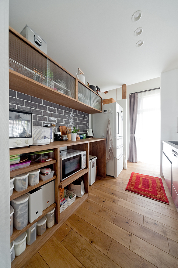 タイル貼りがかわいいキッチン。オリジナル収納は入れるものに合わせて棚を設計