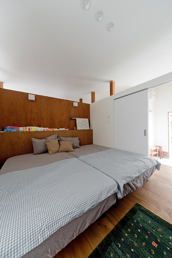 キッチンと背中合わせに配置した寝室はベッドが置けるサイズ。ベッドヘッドは子供の本を収納できるよう設計