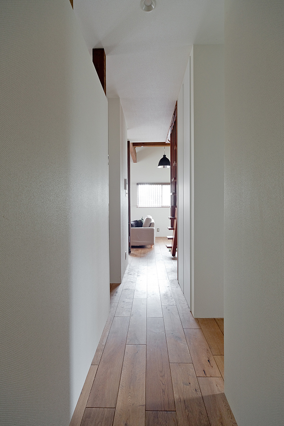 まっ白な廊下の先に見えるリビング。寝室の壁は天井との間に隙間があり、柱が見えるデザインに
