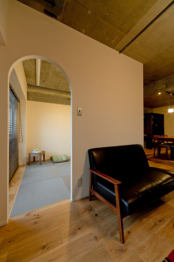 和室はMさんの好みでLDKとアールでつないでいる。和室はバルコニー側を板張りにすることで縁側的な雰囲気も