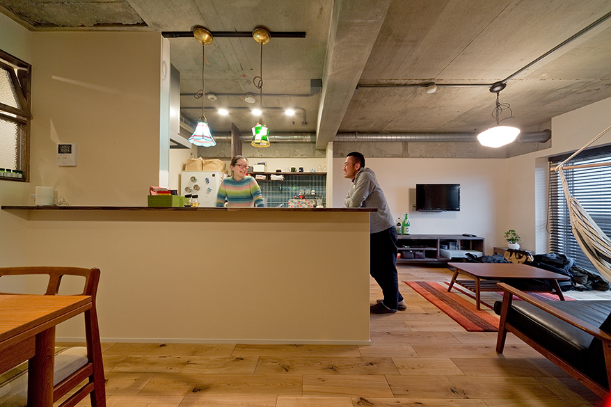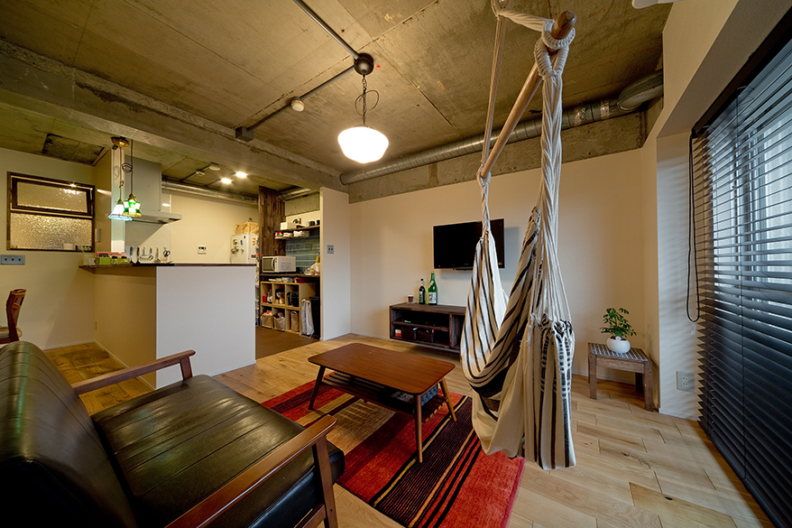 「どんな間取りにしたいか、ではなく、どう暮らしたいか。そんな問いかけから始まったリノベなので、どんな感じになるんだろうと、ワクワクしました。和モダンにしたいとお話しすると、昭和の喫茶店というキーワードでイメージを共有。細かいところまで提案していただきました。今では、ハンモック、デスク、ソファと、どこでくつろごうかと迷うくらい(笑)」とご主人。奥様は「そうそう。電話して出ないから、は?と思っていたら、ハンモックで寝ていたことが3回ありました!」。本当に楽しそう。